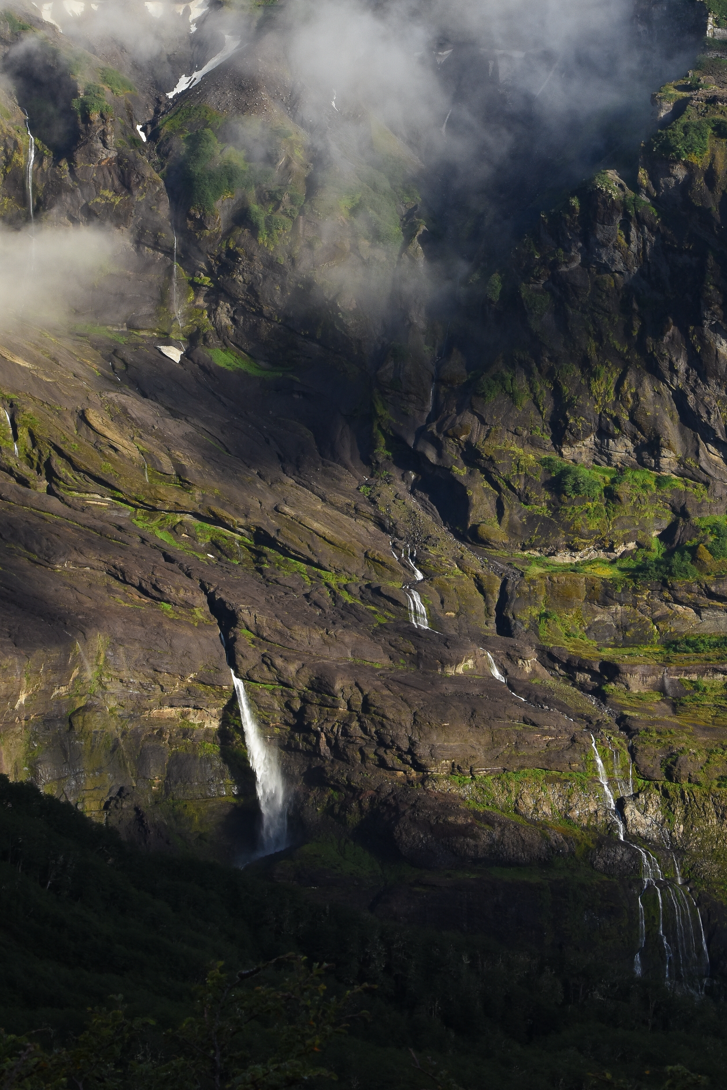 Just as abruptly, the rip heals, and white pours back into the valley. But now the veil’s power has weakened, and the scene changes nearly with every blink. First white, now grey, now a panorama of vivid primeval glory. Strips of sunlight chase the wily fog up the mountainsides. The wind is so persuasive that it overpowers gravity, reversing the flow of waterfalls so that they pour upwards into the sky.