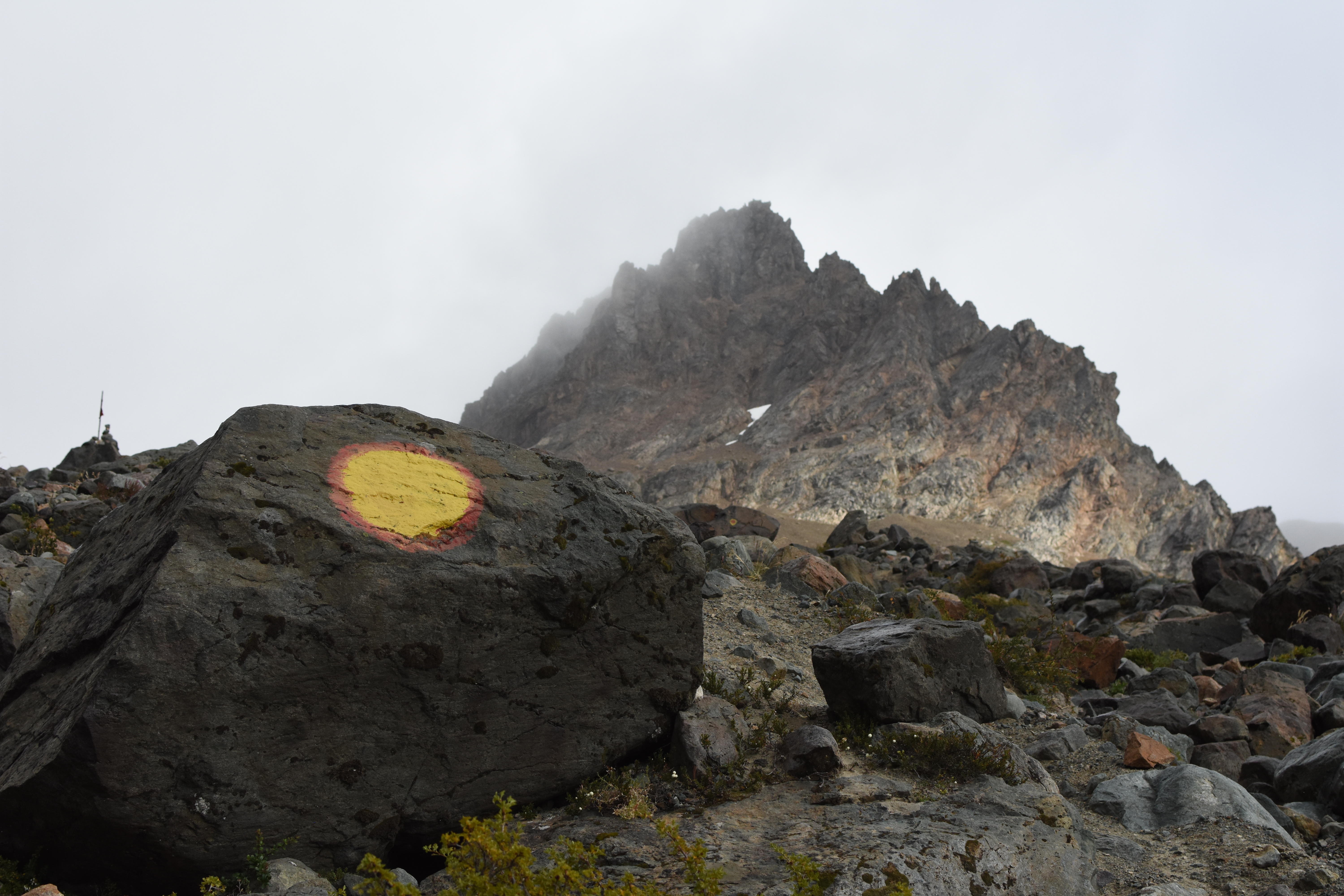 The next morning I realize I may have some issues with my ego. I see a trail labeled โvery difficult, allow 3 hours for the climbโ and think to myself ‘Ha! That’ll be like an hour, tops,’ conveniently forgetting everything I had just learned the previous day. Now look at me. Not even halfway up the mountain after two hours of scrambling, and I’m 4-wheeling it again. The rocks in this capricious boulderfield keep shifting underneath my torn hands, like they never learned about physics. All I can do is keep contact with as many rocks as possible and hope at least a few of them stay put. Rock cairn trail markers would be absolutely useless in a boulderfield, so instead I follow a precarious trail of enormous painted bullseyes that will ~ allegedly ~ lead me the safest way up the mountain.