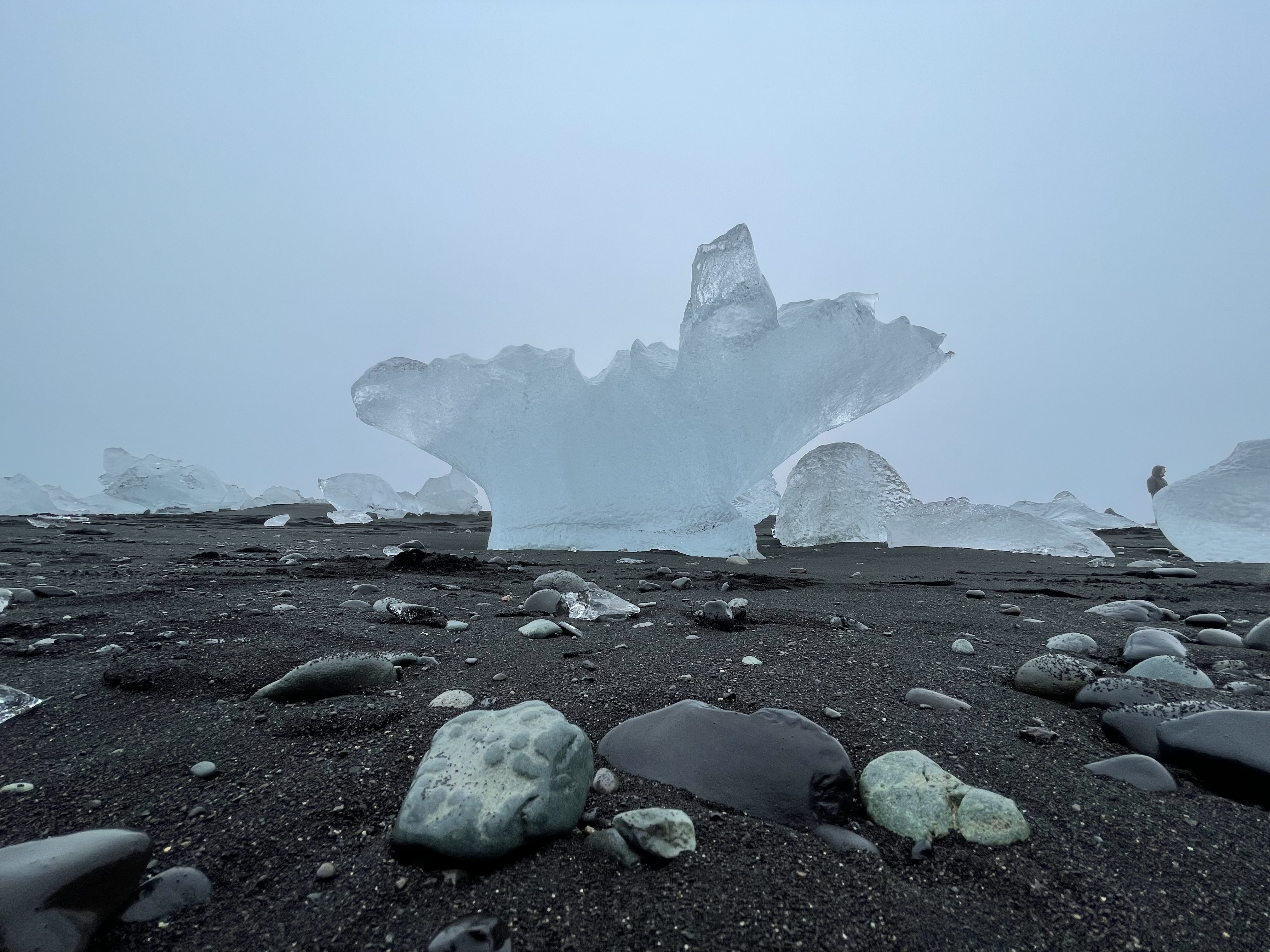 The entire dam rippled. The upper section absorbed the hit like a rugby scrum, but the inertia traveled down through them until finally a few smaller bergs at the bottom snapped free with a delicious billiards-like crack. They careened downstream, past the downy ducklings and sleek seals playing in the barely-liquid water, then under a bridge that frankly didn’t seem tall enough to allow their passage. Finally they shot out into the frigid North Sea, where they were captured by long grey rollers and tossed back towards the shore of Diamond Beach. Iceland was not quite done with them yet.