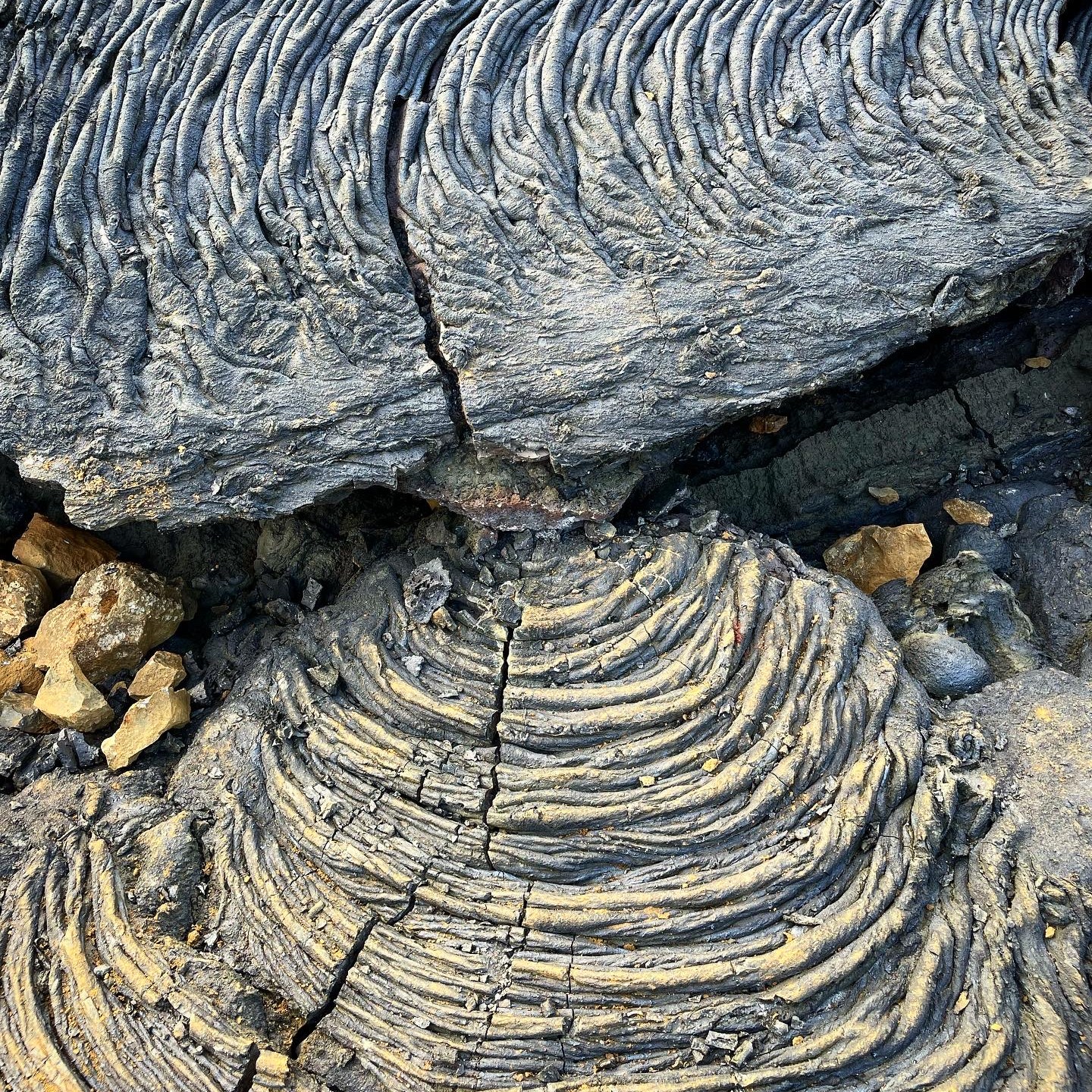 A web of old trails criss-crossed the golden landscape, but most of them ended abruptly at the lava field, having long ago been devoured by a capricious lava river. The lone surviving trail led me to the foot of this cooling lava field before I could even see the active crater, but I was still so shocked by its existence and my presence next to it that my jaw hung open like a cartoon character. The jagged field of black glass simmered with residual heat and belched beige steam. Shapes I would never have associated with lava rippled outward from my toes: knotted ropes and folded sheets, schooner’s sails and horse’s manes, all frozen in warm black glass inexplicably laced with iridescent sapphire. I touched one of Earth’s newest rocks and it gripped at my skin like a cat’s tongue.