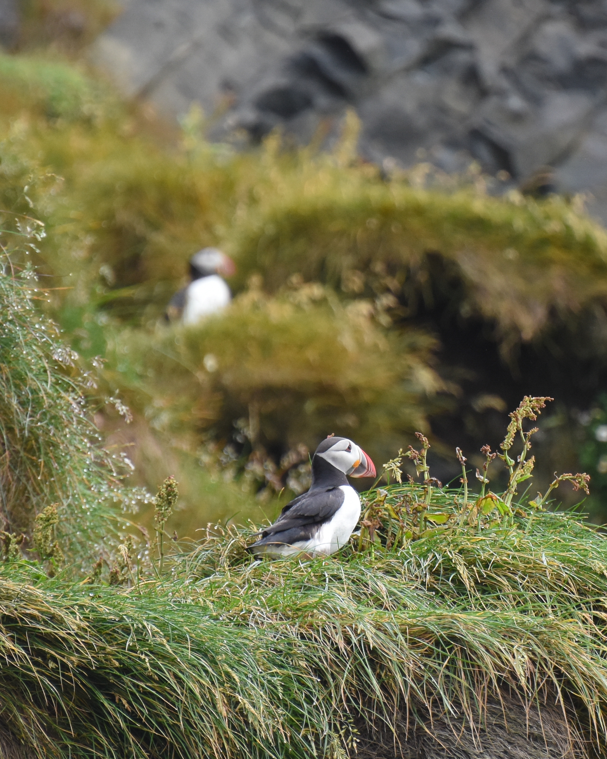 We were so charmed by these graceful-clumsy birds that we made three dedicated stops to see them near the town of Vik, at Dyrholaey and Reynisfjara black sand beach. The landscape warrants a stop even if the birds aren’t around: it’s a hexagonal basalt-column wonderland filled with cliffs and caves and sea stacks and a black sand beach that stretches for miles. When the birds are in town, though, the landscape almost doesn’t even register, because your attention will be so thoroughly captured by these belly-flopping masters of subarctic fitness.