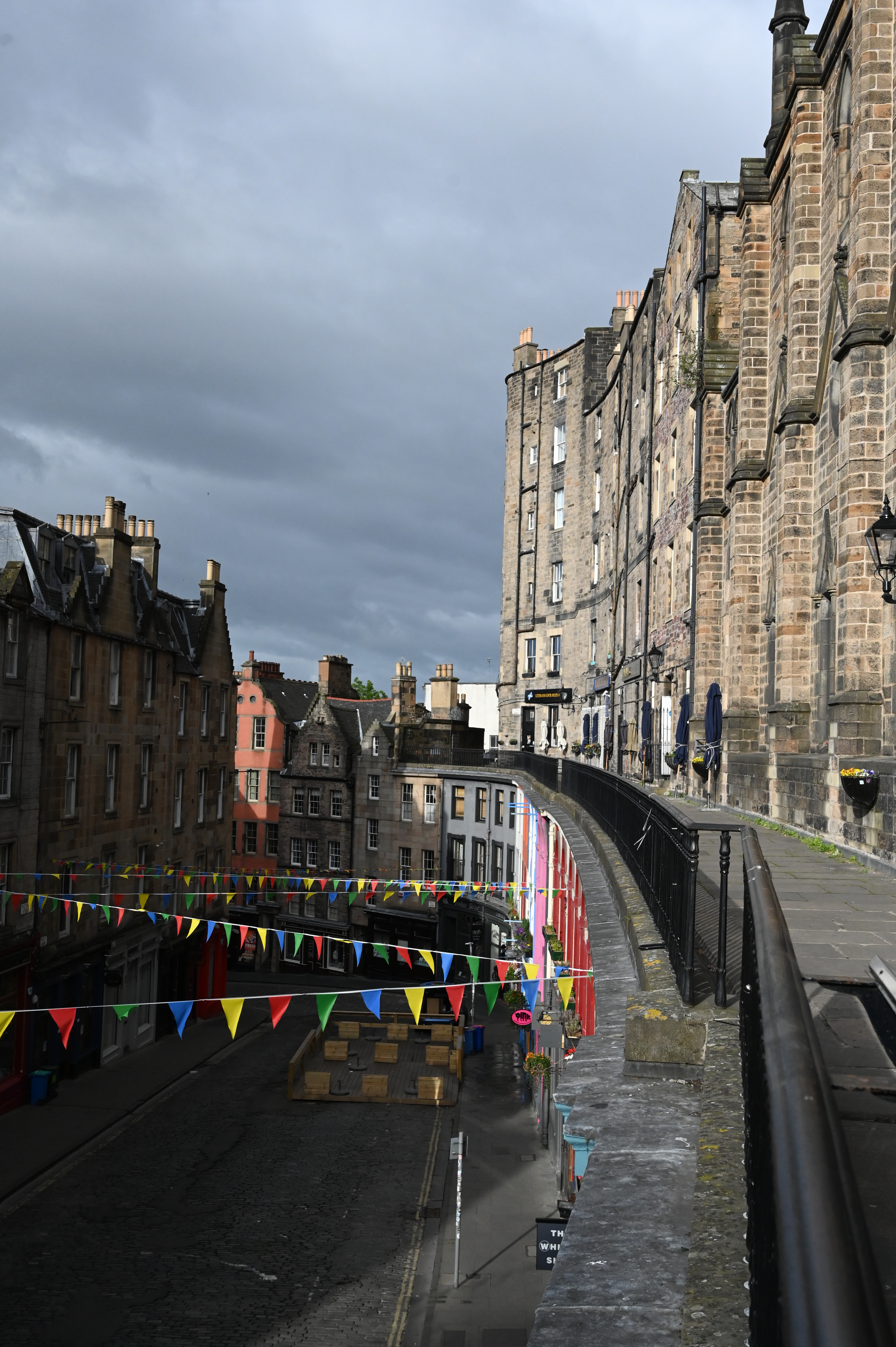 The physics of real-life Diagon Alley never made sense to me even after I walked down, around, and through it multiple times. The street has three different names depending on where you’re standing: Victoria Street or Victoria Terrace or West Bow, although the most mystical transition among the three is an enclosed staircase that’s disappointingly stationary and apparently visible to every Muggle passing by. Regardless, it’s a magnetic street. Edinburgh, like most UK cities, is mainly colored the sort of grey that makes you wonder whether the cloudy skies have done nothing more in the past few millennia than seep their way down into the local stone. The upper part of Victoria Street or Victoria Terrace or West Bow or Diagon Alley is no different, but then its feet are splashed with a riot of unexpected color, like the skies haven’t had the time to bleed quite so deep yet. I started going out of my way to walk down the street again to see how that hour’s light was playing with this rainbow hiding at street level. One morning I arrived just before a squall, when the light had space to gallop down the whole length of the street and splashed against the far end, brightening even the grey stone and the livid clouds carrying in a threat from the west. I forgot I even carried a camera until the clouds had nearly reached the sun.