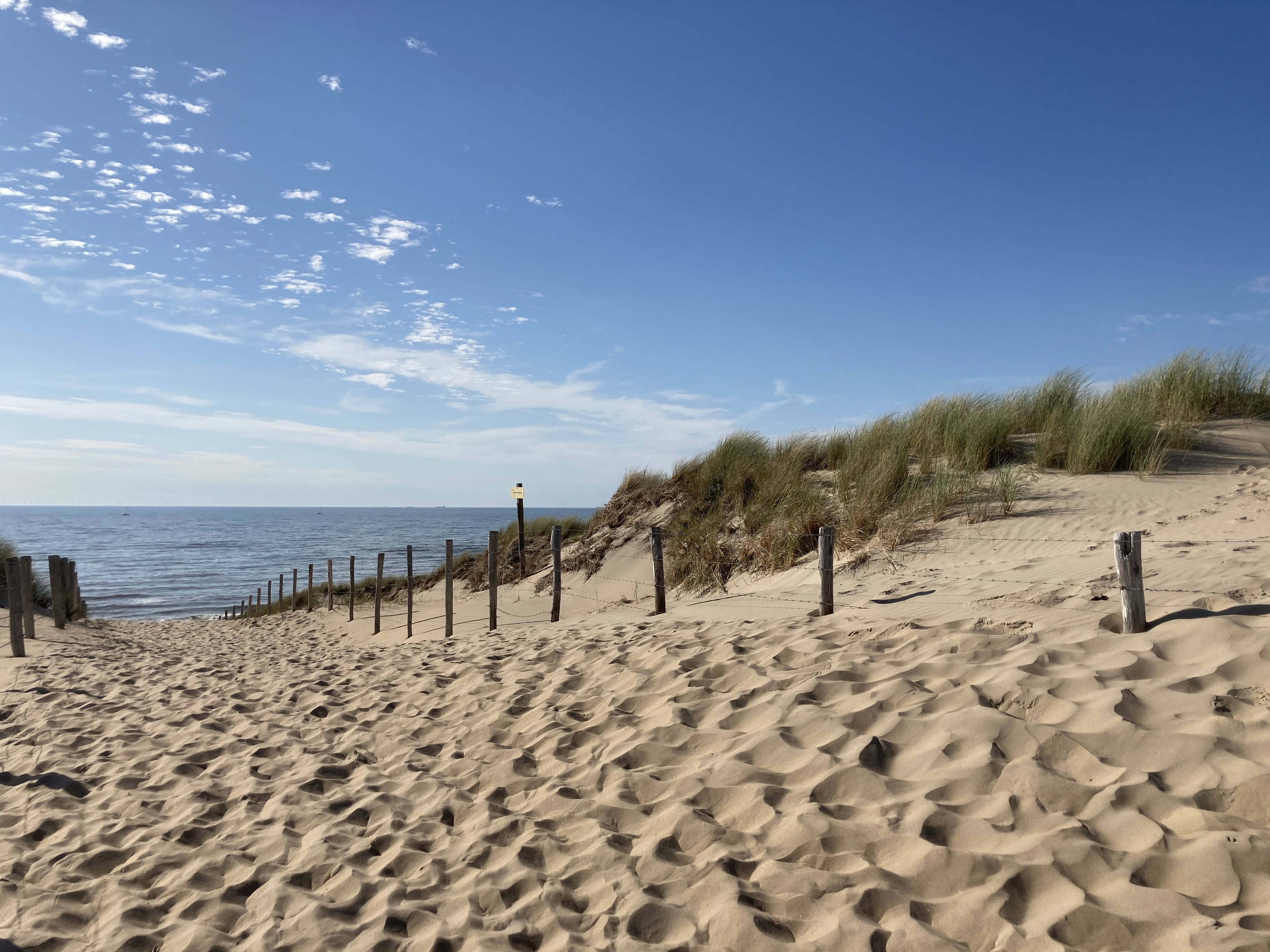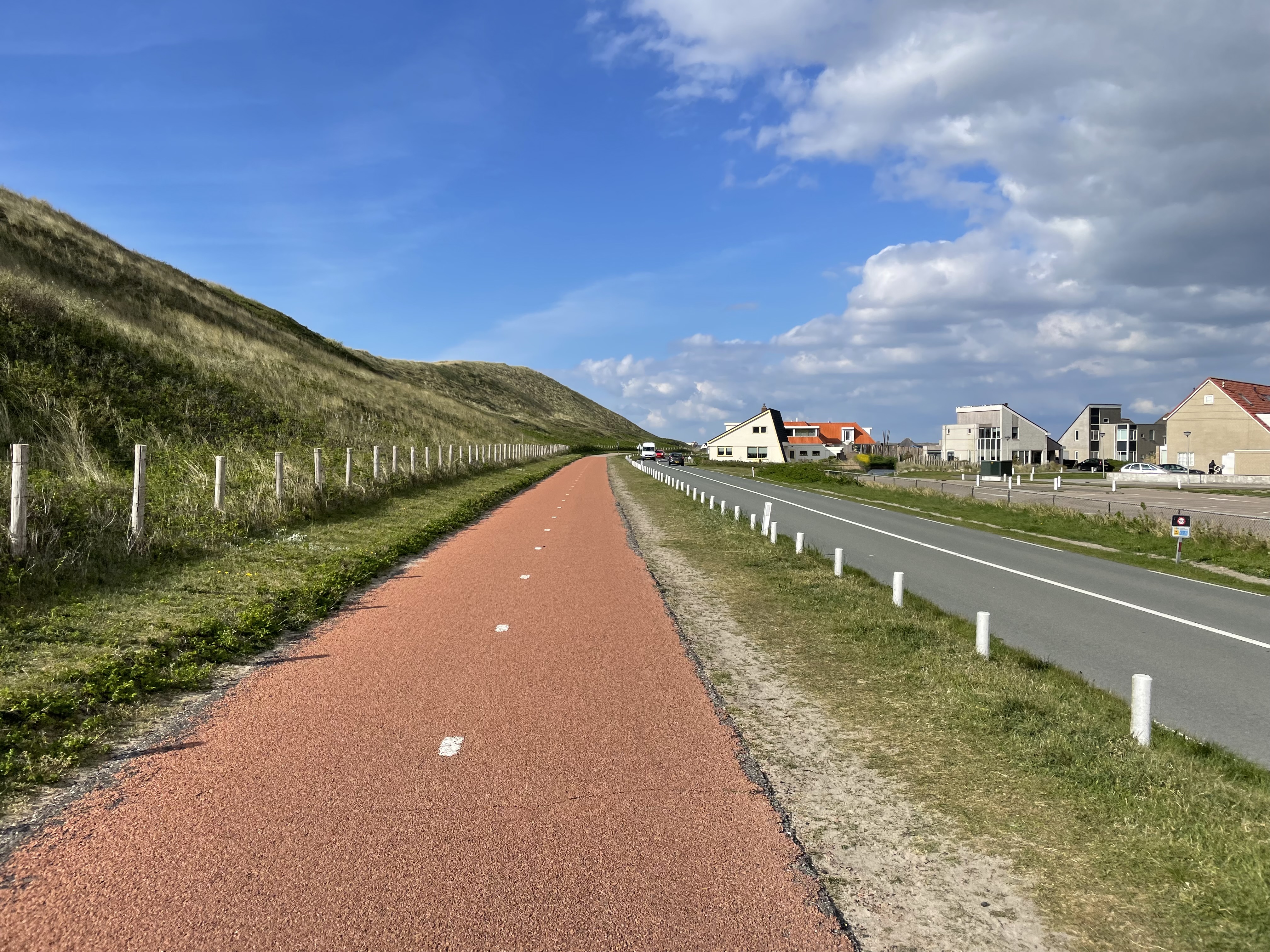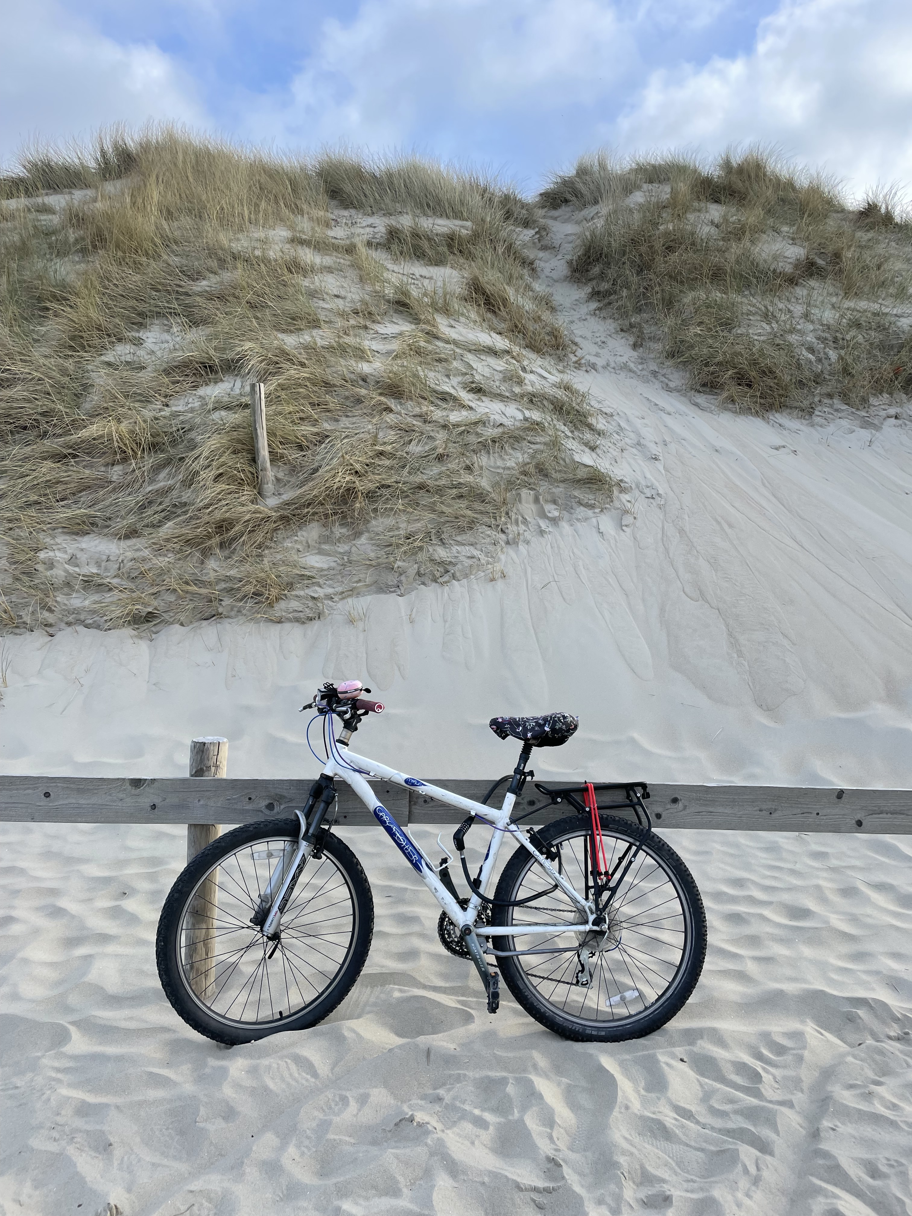 Only 40 kilometers in, I was so exhausted by the headwinds that I just stopped at the nearest dune path. I locked my bike to the weathered wood but trusted my unsecured panniers to the good people of the Netherlands. My legs felt like jelly and I scrambled up the warm sand about as gracefully as an eel up a staircase. The seabreeze headbutted me again as soon as I crested the dune. Once I recovered and looked out, I was delighted to find that I had not accidentally chosen to visit a nudist beach (about 2:1 odds, in my anecdotal experience). I sank to the ground to devour a peanut-butter-and-jelly-and-sand snack amongst a tangle of wild beach roses.
