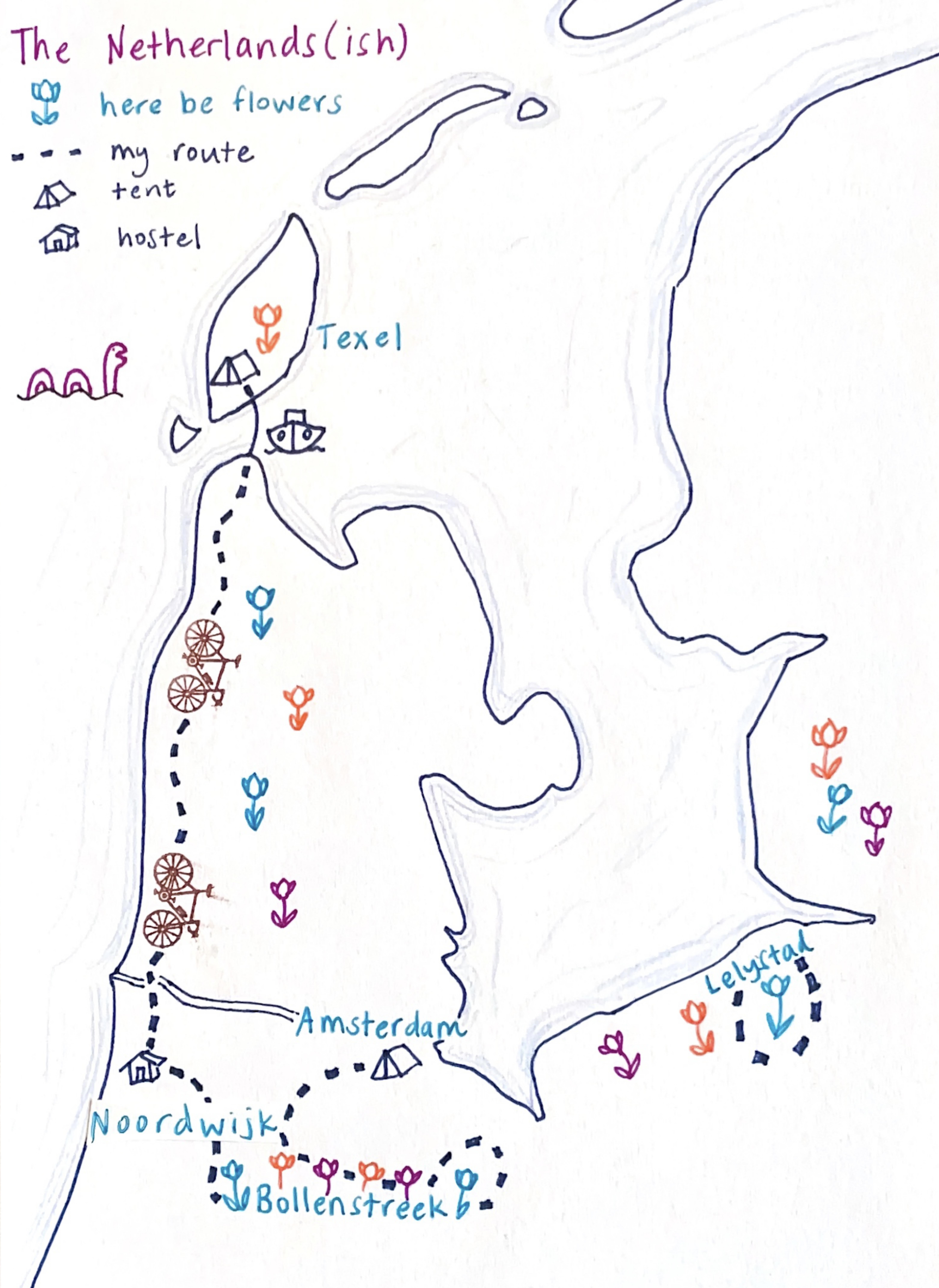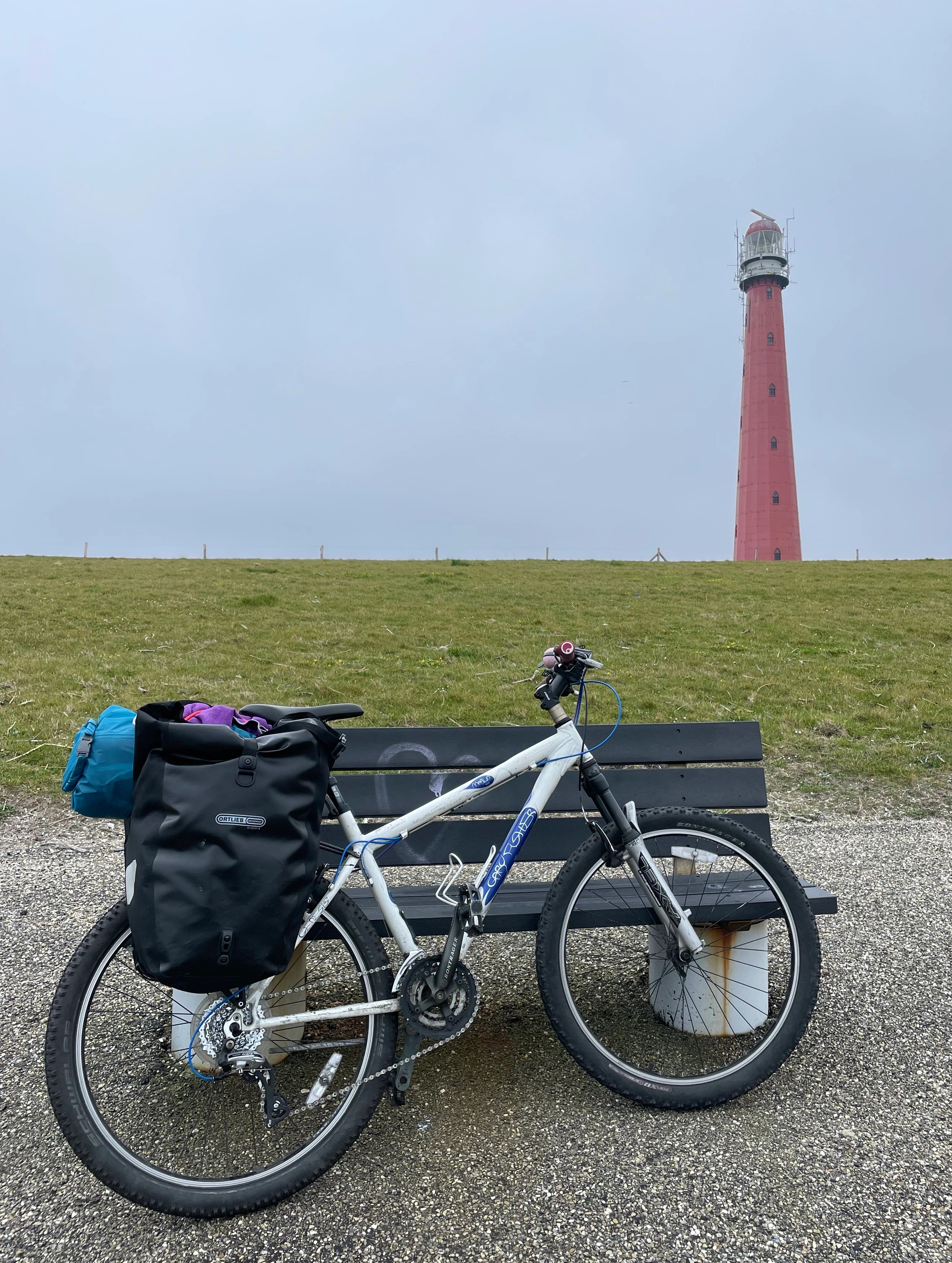 My route would start on the island of Texel, the first in a string of barrier islands shaped like Morse code that beep their way across the North Sea to Germany. From there I’d pedal south down the coast to Noordwijk, then dogleg inland through the famous Bollenstreek tulip region before ending in Amsterdam. I’d spend the first and third nights in the tent and the second in a hostel. That meant, in April, in a country nearly as rainy as England, I’d have just one night with a solid roof over my head and would otherwise be protected from the elements by either a baseball cap or a thin layer of nylon.