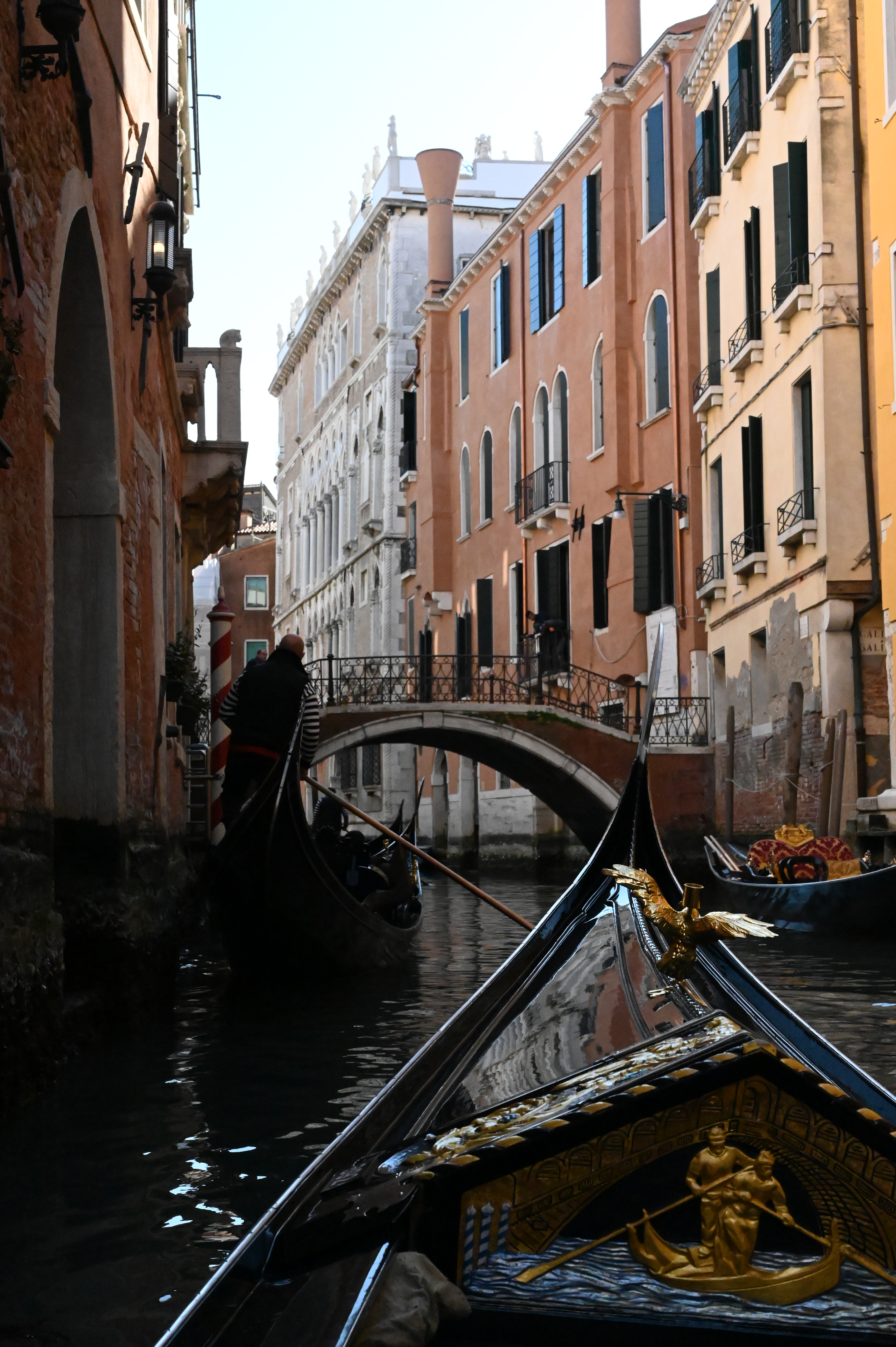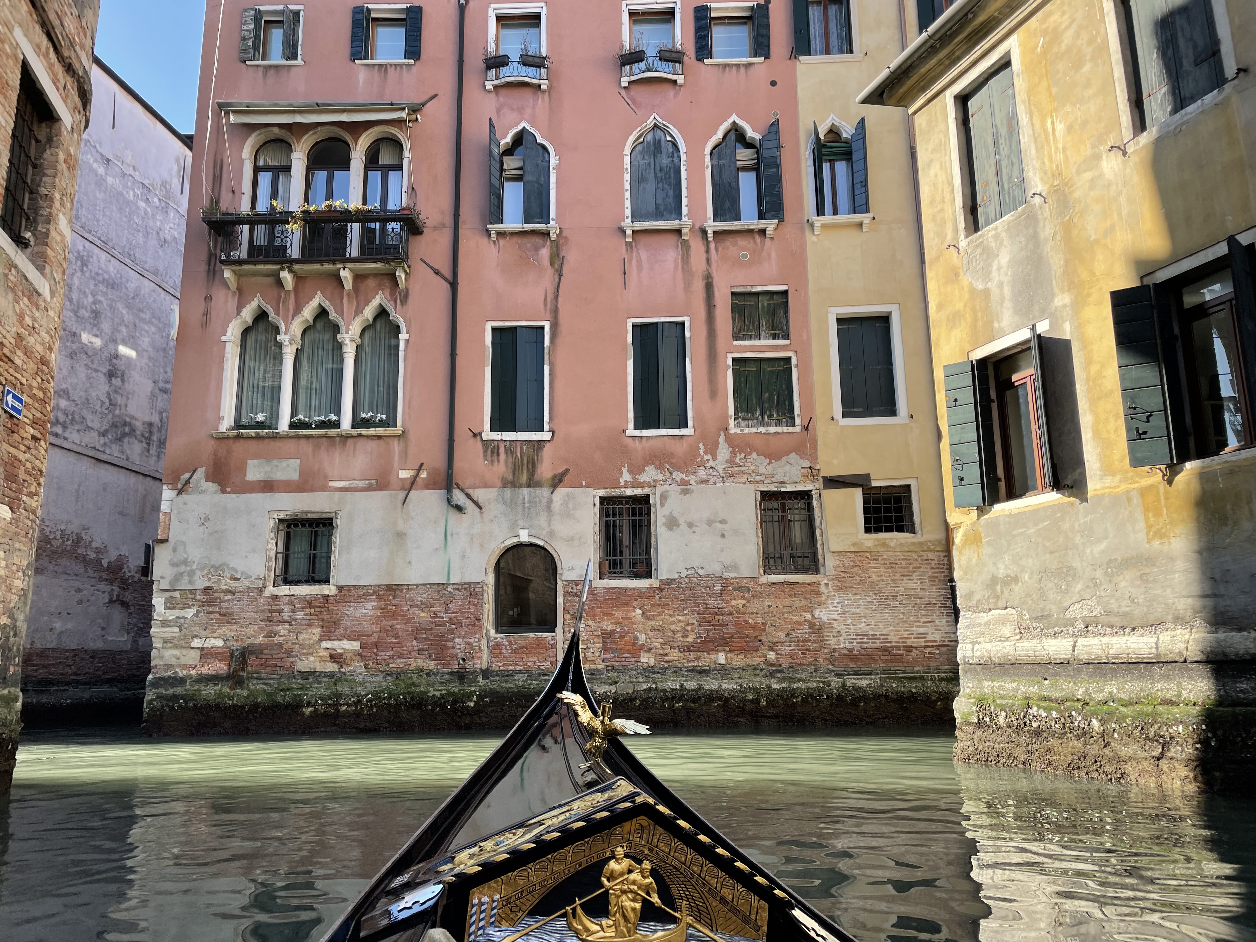Without so much as a whisper, we slipped away from the dock and into the secret water world beyond. Anzolo pushed the 4-meter oar in one direction while literally kicking off a priceless ancient wall in the other. A finger of sunlight pointed us down to the end of the first canal, but as soon as we turned it was severed and we plunged into midday twilight. Only the tips of the buildings burned orange.