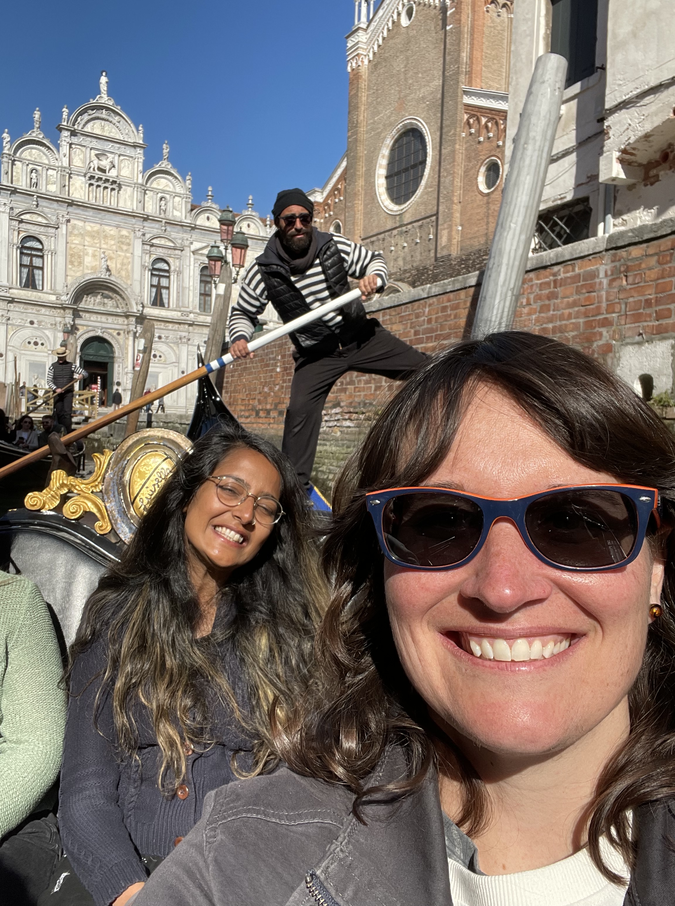 We should have taken it as a hint when we were greeted with spread-eagle arms that Anzolo was a hugger. No sooner had we all spoken our names and origins than he moved in for the first bear-hug. “You need to give 5 hugs per day,” he insisted, and I could tell he’d already overdosed on daily hug-drugs by the time we’d come along. He was no taller than I but barrel-chested from the physical labor of gondoliering. I ducked around the stiff sharp brim of his hat and tilted my face towards the sun as I allowed this complete stranger to embrace me, still an odd thing to my Midwestern sensibilities. His trademark striped Merino sweater was kitten-soft beneath my fingertips.