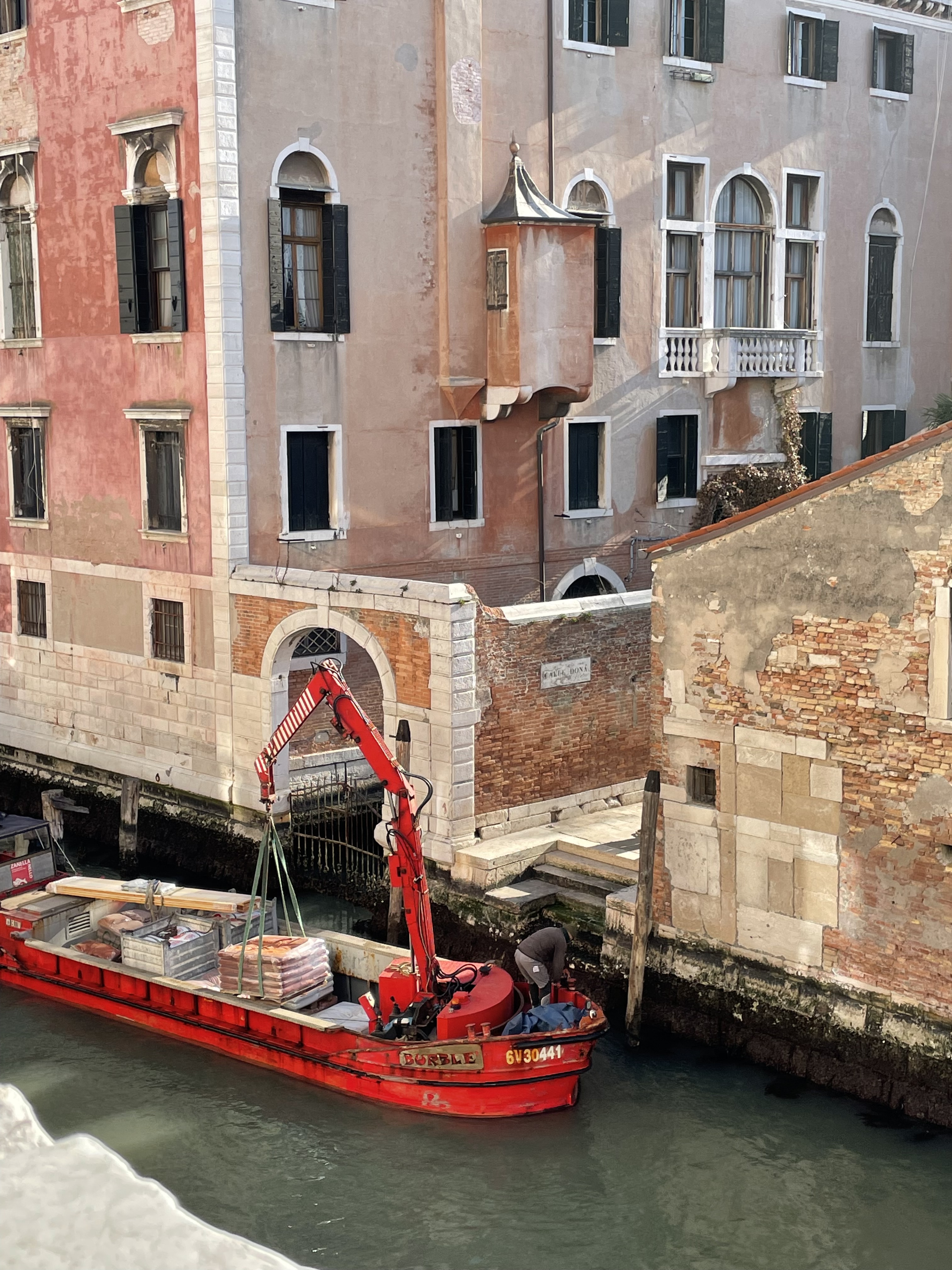 The plaza at eye-level blossomed with springtime travelers walking everywhere and nowhere at once. Venice is an exclusive city: the only terrestrial traveling method is on foot. Wheels are precluded by endless stairs on the bridges, so there are no cars or scooters or bikes, and even wheeled luggage is a pain in the ass. To travel here is to slow down and move under your own steam (or at least the steam of a strapping gondolier). Yet there exists an even-more-exclusive layer, because half of Venice is hidden. Not underwater but on the water, a literal maze of canals quickly twists beyond the eyesight of anyone who is not borne upon a boat. This secret aqueous network holds the lifeblood of Venice, in many ways I couldn’t have imagined before I visited. Behind me loomed one of the world’s most beautiful hospitals, and its fleet of high-speed ambulance boats rocked gently in the Venetian lagoon beyond. Barges churned past them, laden with kegs headed for restaurants or construction materials and cranes. And before me, a line of low rainbow doors flanked the watery street, a term that’s not hyperbole – even Google Maps’ Street View works on Venice’s canals.