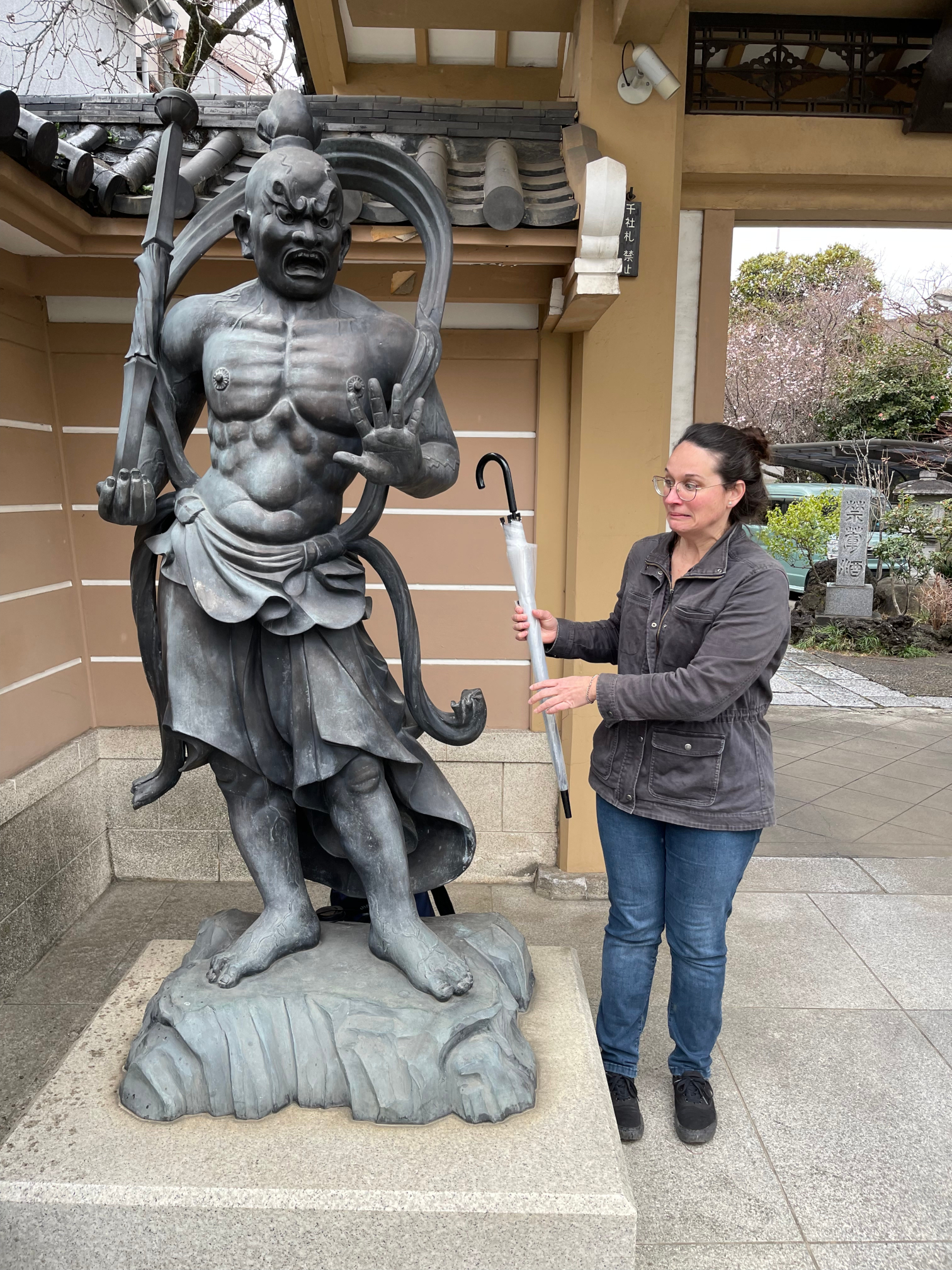 Back out on the street and back on track to Imado Shrine, with freshly-cleansed hands and souls, we came across some huge guardian statues with ugly faces. I’m never one to pass up the opportunity to pose with a statue and copy its dumb face, so I stood next to one and tried to contort my expression in the same way. The statue was holding a stick, though, and I had no suitable props. Yasin – and this time I will throw him under the bus, since it was absolutely his idea – spotted an umbrella that was propped against an adjacent residential door, and he decided to “borrow” it. Despite my protests, he stuffed the umbrella into my hands and I became an accomplice. Not ten seconds later, before we even managed to take the freakin’ photograph, two businessmen exited the same door and started frantically running around, clearly looking for their umbrella. I froze with the evidence clear as day in my hands. At first I tried to hide behind the statue while I figured out how to handle the situation. I looked to Yasin for help, but he did absolutely nothing besides continue to take pictures of me, possibly for police evidence. Finally I ran over and gave them back the umbrella, while bowing and pantomiming what I hoped looked like a groveling apology. As we hastily walked away, our Buddha’s Curse joke solidified. What horrific luck, to borrow a prop for a photo and come out of it looking like thieves who can’t even explain the situation. At least we were headed for another shrine, so I could cleanse my hands and soul again.