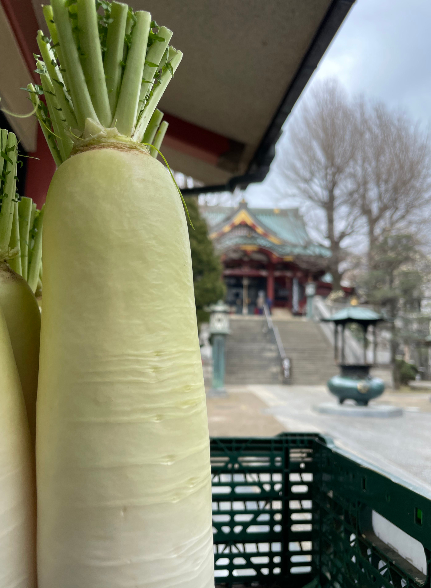 On the second morning when I opened the blinds overlooking our narrow suburban street, every suited businessman and uniformed schoolchild criss-crossing the intersection was carrying a folded umbrella, in a portent of what was to come. We were feeling bolder and mostly healed of jetlag, so we decided to go further afield. We first headed north to Ueno Park to visit some temples, and it was there that we had our fateful meeting with the citrus tree. After grabbing the fruit and exiting stage left, Yasin tore into it and gave me half. The first warning sign that something was amiss was that the “orange” he picked was bitter and tasted more like an unripe grapefruit than an orange. I struggled through a waxy quarter of the fruit before I chucked the rest into the bushes (an act of waste probably also not looked upon fondly by the Buddha). The felted clouds started spitting rain shortly thereafter, and the drizzle steadily increased over the next 8 hours, eventually soaking us to the bone while we wandered the most populous city on Earth. On our way towards Imado Shrine, which was entirely devoted to lucky-cat statues, we stumbled upon a parade of umbrella-carrying monks exiting Matsuchiyama Shoden Temple, where worshippers exclusively offered huge white Daikon radishes to Buddha (the themes at some of these religious sites were truly inspired). We cleansed ourselves as we had learned the day before, then entered the silent temple to kneel on the floor while a monk painted our goshuin. I’m functionally agnostic, so I decided to pay my respects to the temple in the currency of gratitude instead of prayer. Staring up at the intricately-painted ceiling, I cast that day’s gratitude into the silence of my own mind. I thanked the gods, just in case they were listening, and their local human believers, for being so overwhelmingly welcoming towards my clueless foreign self. I thanked the long-gone people who had built and decorated the incredible building with their bare hands. And I thanked myself, for finally coming all the way to Japan, and Yasin for faithfully following along.