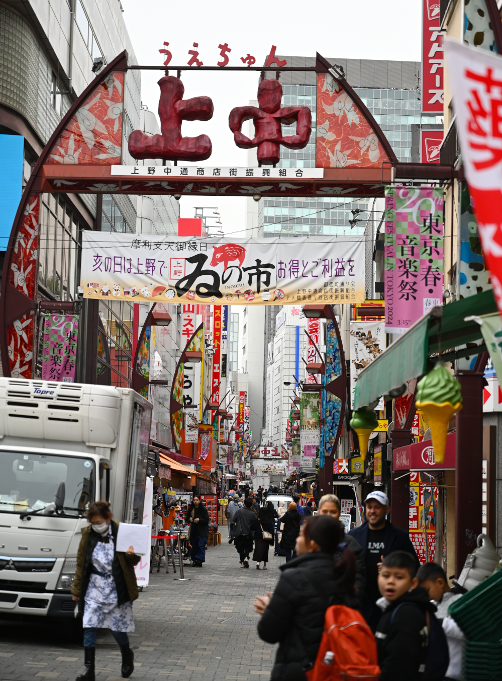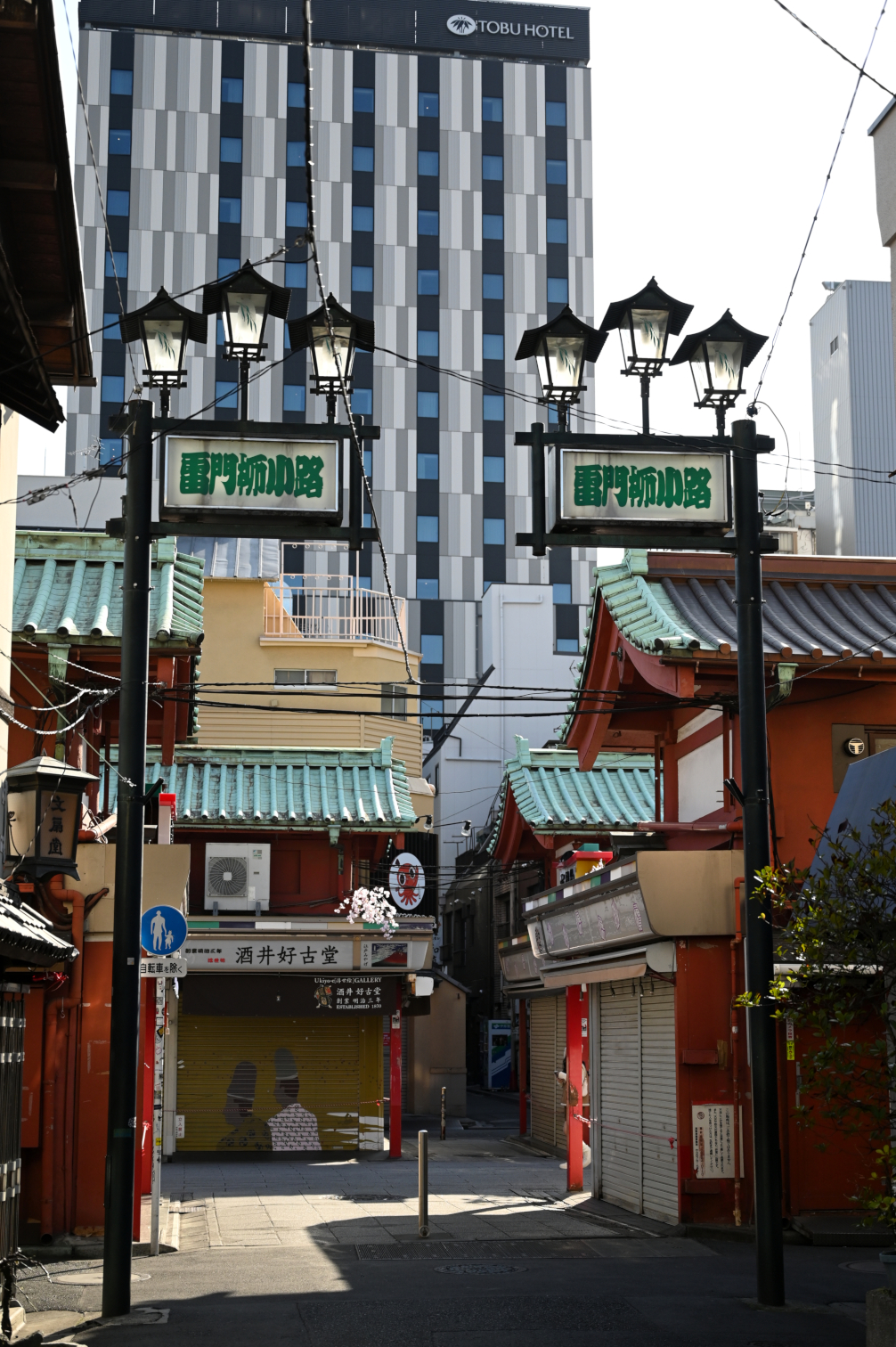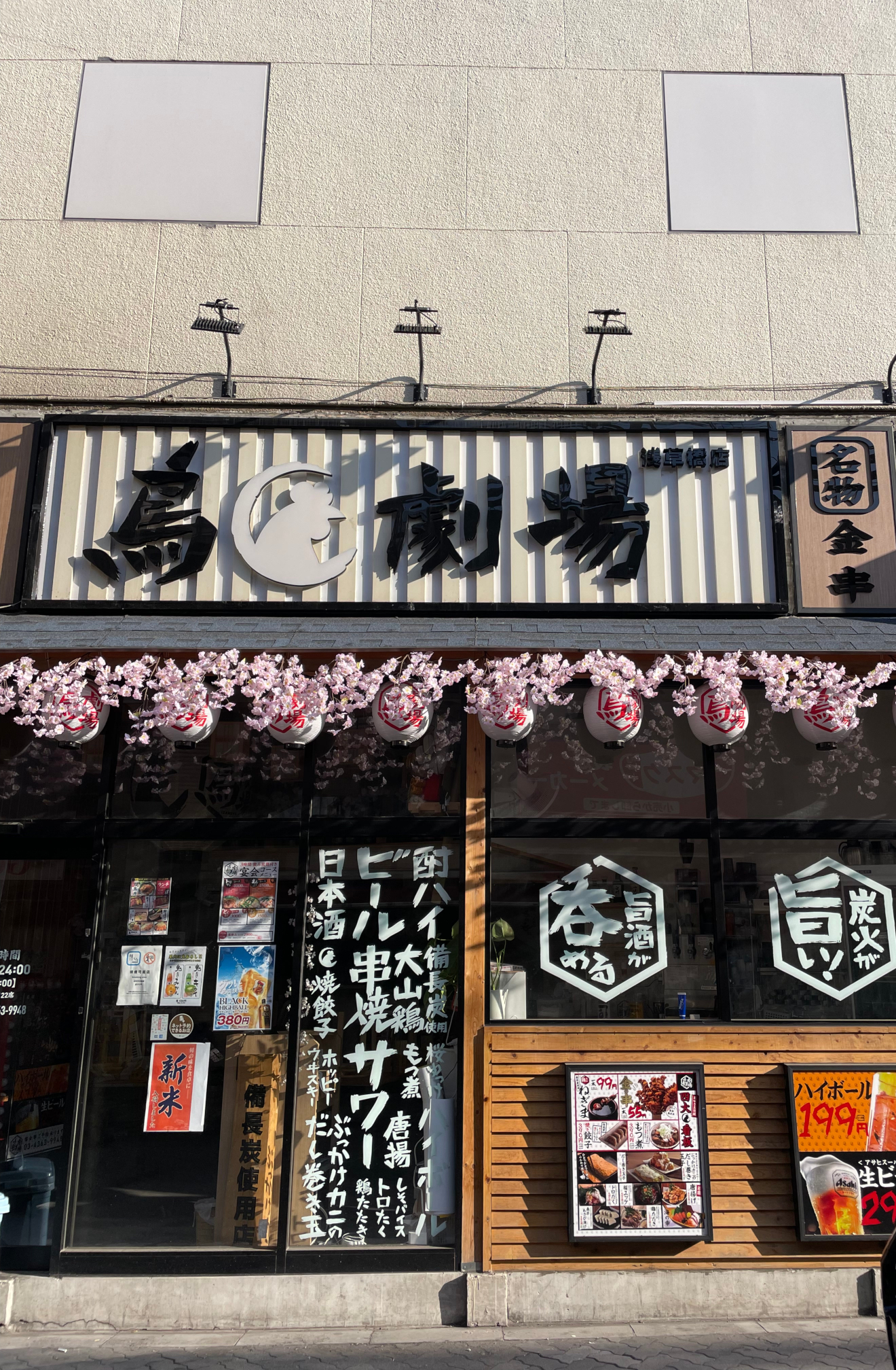 Left: Streets near Sensō-ji Temple before the shops opened / Middle: A chicken shop (maybe?) decorated with sakura / Right: Street scene near Ueno Park