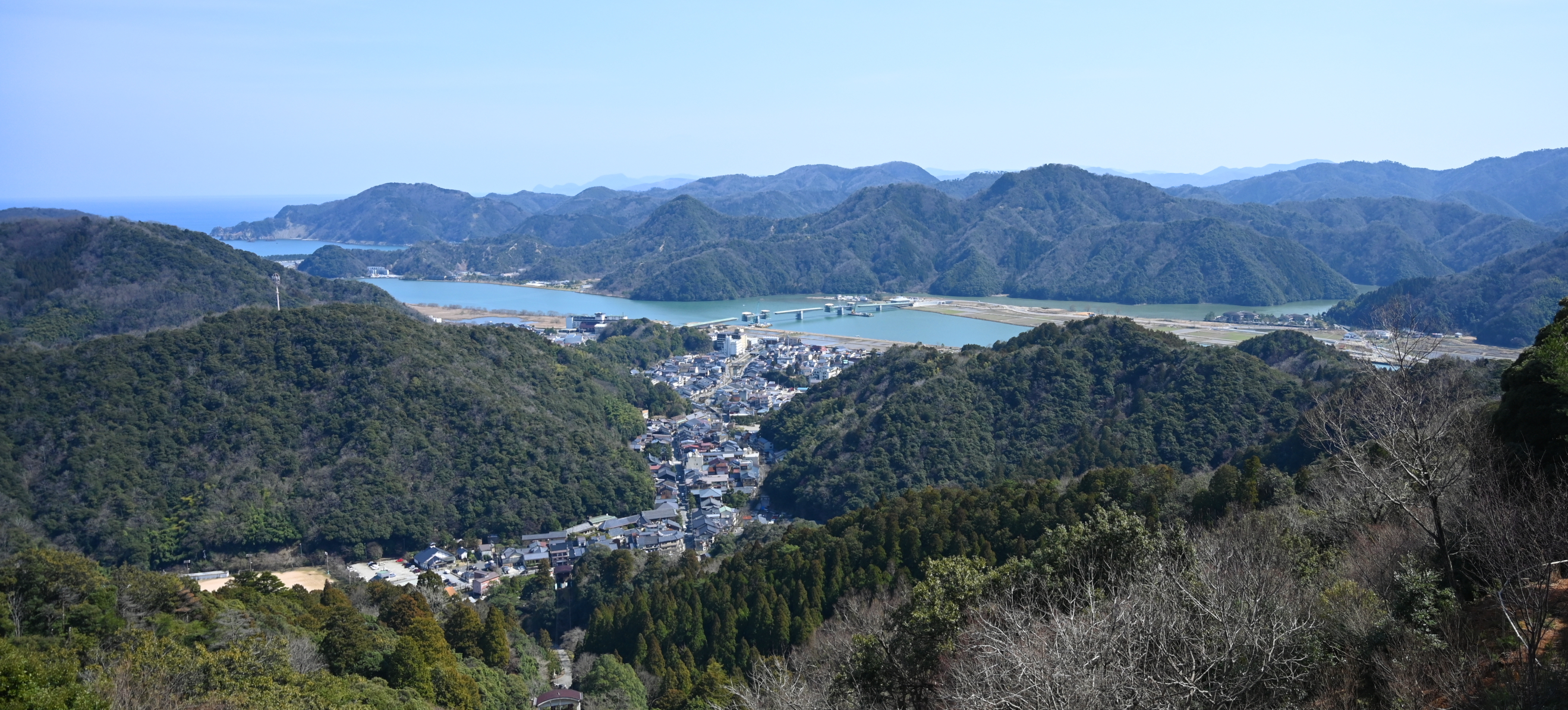 Bottom: View of Kinosaki Onsen in its valley, the much larger Maruyama River, and the Sea of Japan to the left