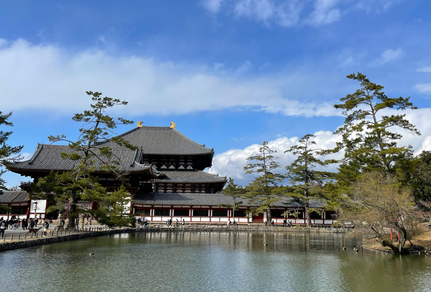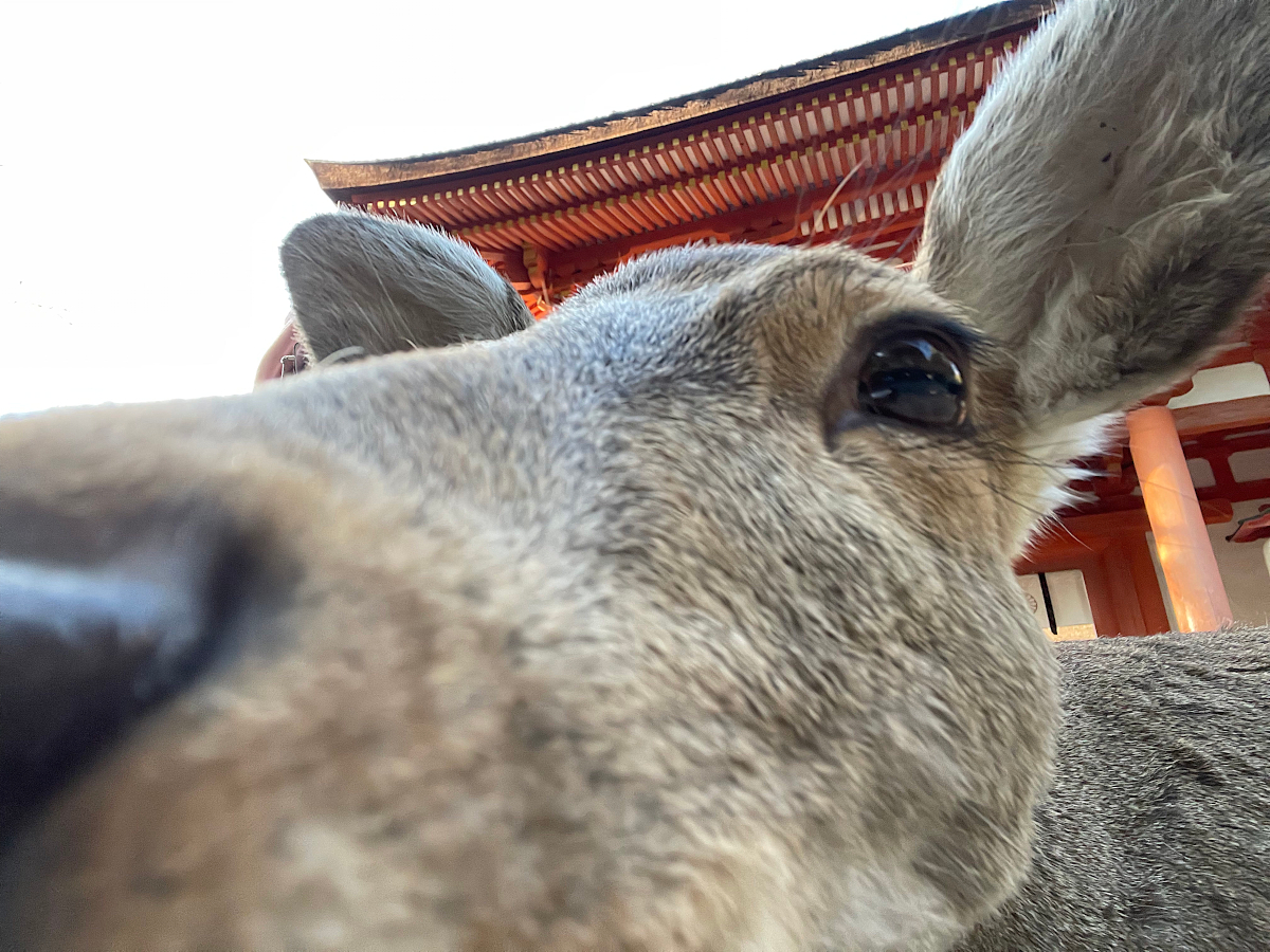 Both the history and the deer are happily concentrated in the same park, and we came upon the deer first. Being a curious person who’s also leery of human-animal interactions, I took a nibble of one of the biscuits we’d bought before I handed any to the deer. Grassy bread is the best way I can describe its taste. We had arrived late in the afternoon and most of the first deer we found were already sated, napping in the trampled grass amid piles of broken biscuits that had been offered and promptly ignored. We gave them some calorie-free pats on the head instead and moved on to be engulfed by a cloud of perennially-hungry younger deer. I felt like an absurd bowing biscuit-dispensing machine as I bowed, waited for them to bow back, and fished a biscuit reward from my pocket, giggling helplessly the whole time. Their individual personalities were delightful. Some deer moved like chickens, reflexively bowing with every step like they weren’t sure how to turn it off. Others were polite enough to bow even though they were already full. Still others had formed organized crime rings, as I found out the hard way when I was beset by three deer at once. Two occupied my biscuit-filled hands while the third came from the side and gently T-boned my hip before sticking its snout directly into the biscuitmine in my coat pocket. I looked to Yasin for assistance, but he was busy treating another pair of deer like Labradors, fondly ruffling the silky space between their ears as they munched on their snacks.