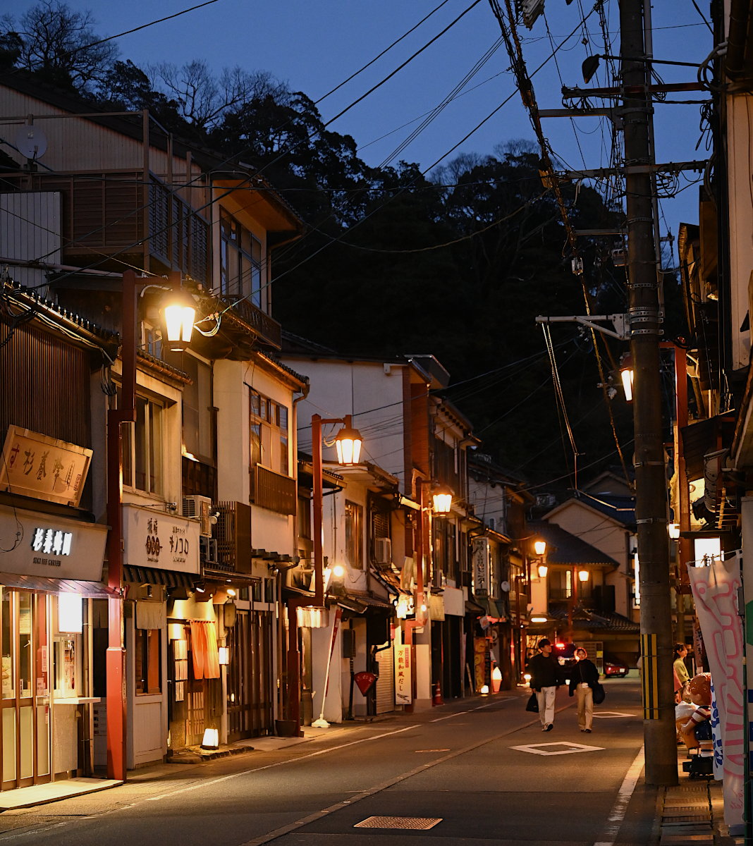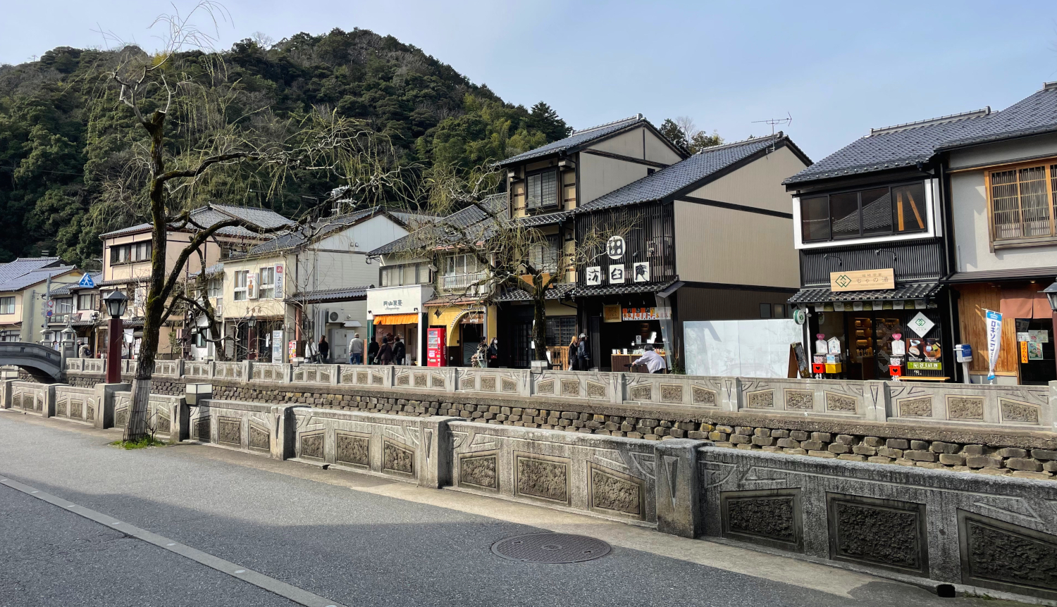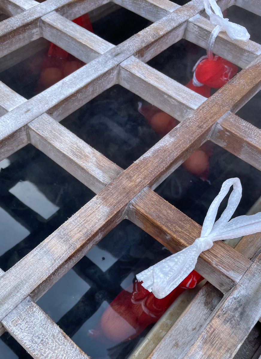Tradition states that, before bathing in Kinosaki’s waters, you must first hike up to the hillside Onsenji temple where the monks first prayed for the hot spring to appear and ask permission to bathe in the springs yourself. You also had to buy a ladle from the temple as proof that you’d completed the quest, and in fact you wouldn’t be let into any of the onsen without a ladle. Obviously I had failed to do this quest first, since modern rules are a bit more lax and the ladle tax is no longer collected. However, I was still on the hunt for goshuin and I wanted to finally experience a real Japanese hike, so I decided to go up anyways. Near the start of the trail was a boulder marking the official hot spring source, where the water gurgles from the ground at a shocking 81 °C. A shallow footbath nearby threatened to cook the feet off my body and I could do little more than rapidly flail my heels in and out of the pool like I was dunking a teabag. Next to the footbath there stood an ice cream shop with an egg-boiling pool where you could buy a few raw eggs and dangle them into the pool using what I can only describe as a red mesh scrotum tied to a wooden lattice. I can’t say I’d ever seen a combination footbath/ice cream/egg-boiling establishment before, but I guess I’d never been anywhere like Kinosaki Onsen before either.