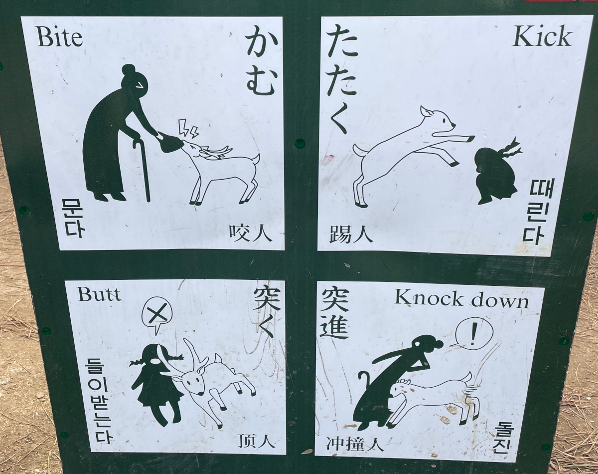 Top left: Shortly after a wet-nose-kiss to the forehead / Top right: a warning sign reminding people the deer are wild