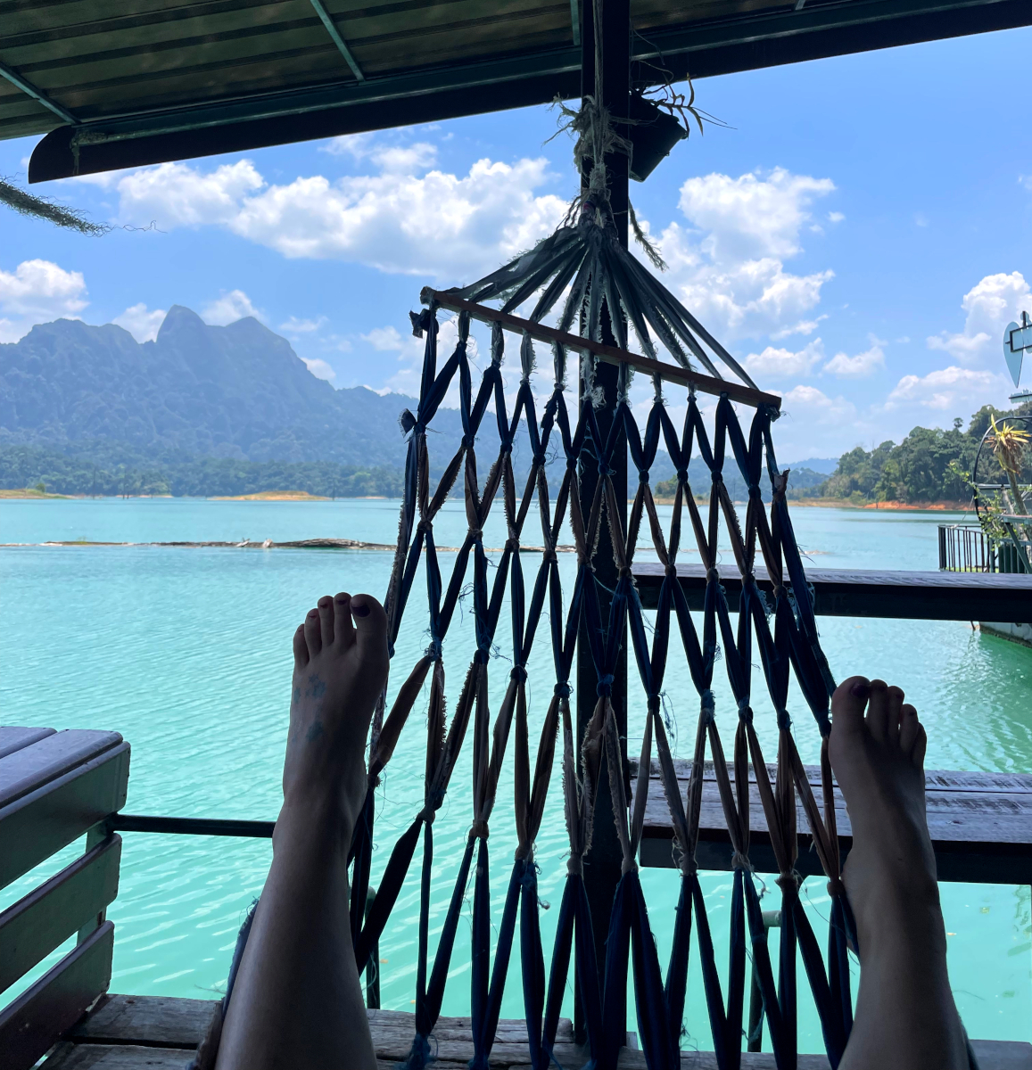 I coasted back to my cabin to find that the interesting local couple was living in the cabin next to mine, and we all took this as a sign that we would be each other’s Hostel People for the next 24 hours. Before I’d even finished tying up my kayak, they’d invited me next door. I didn’t even bother putting on pants before I went to introduce myself to the English immigrant and their Thai fiance, who had driven up from their hometown of Phuket to celebrate their fourth anniversary. Our hostel had a cute no-outside-alcohol rule, which everyone had predictably ignored. I settled onto a low-slung hammock chair that decorated their porch and was handed a cocktail made from an unknown Thai liquor, complete with ice cubes pilfered from the kitchen’s gigantic coolers. We began the age-old tradition of befriending complete strangers, trading life stories and intercultural jokes. I learned that the local woman was ethnically Thai but had grown up “stateless” in a jungle village that was technically located in the neighboring country of Burma. Her perpetually-melting English fiance had arrived shortly before the pandemic, gotten stuck on their way to Australia, and just decided to stay and teach English. The heat and my constant dehydration meant I got tipsy easier than expected, and when I stood up an hour later to walk to dinner, the floating walkway swayed alarmingly under my feet.