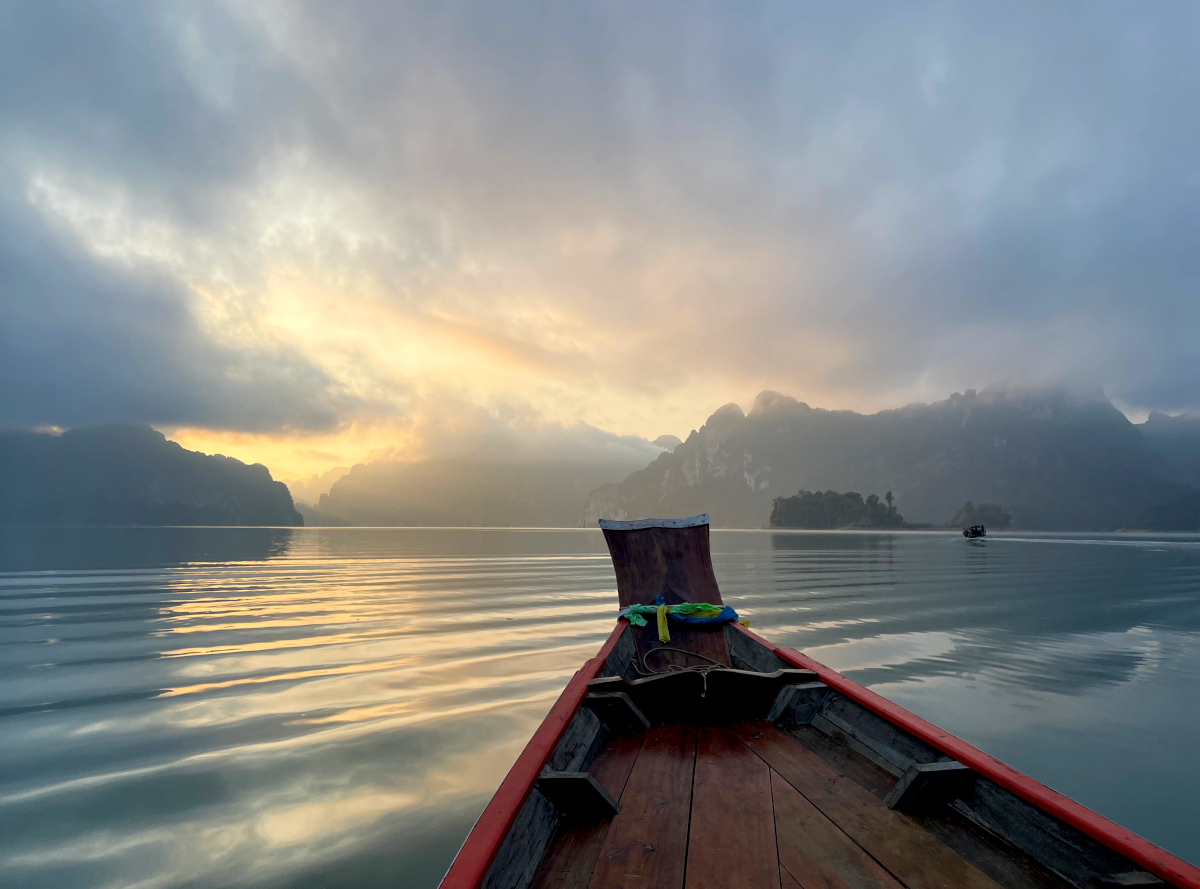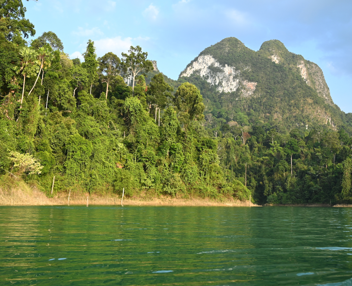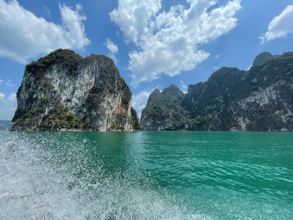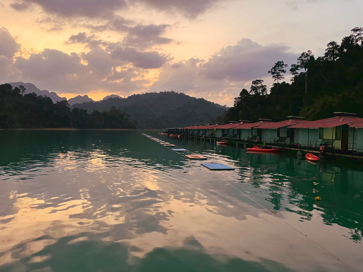 The wooden plank that served as my seat shivered in time with the longboat’s naked motor as we shot across Cheow Larn Lake. Sheer limestone cliffs stabbed upwards from the jade water all around us. Every one of the hundred islands was shrouded in jungle trees that were shriveling their way through the dry season. Black shadows were thrown down the white cliff faces by the high-noon sun, which made the entire world blaze with unforgiving light. I pressed my sunglasses closer against my face, trying to block out its rays, but the ubiquitous mixture of sweat and sunscreen had turned the slope of my nose into a ski piste that my RayBans were hell-bent on sliding down. Our captain wove through a network of impossible islands, often three times taller than they were wide, like natural skyscrapers that had been shaped by the sheer forces of Earth. The boat ride’s final destination was no less surreal than the hour-long journey itself. Our bow was pointed towards a free-floating, all-inclusive, jungle-hut complex where travelers can sleep overnight. Cheow Larn Lake (also anglicised as Cheow Lan or Chiewlarn) has a few of these complexes scattered around, but the huge reservoir was only constructed in the 80s and is still finding its way onto the tourist map, so each complex gets to inhabit its own private appendix-like bay of the reservoir.