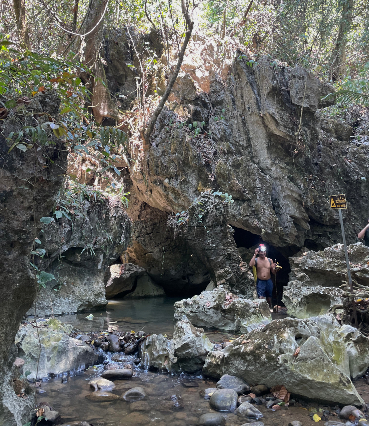 Nam Ta Lu cave is a nearly one-kilometer hike through a pitch-black limestone hole in the ground that’s infested with tarantulas, crickets, and whip spiders (a la the Unforgivable Curses scene in Harry Potter 4). It’s also full of bats, but since they’re my favorite animal, “infested” is the wrong word. The cave was carved by a cool river that still runs through its gullet, and in monsoon season, the cave completely floods and is impenetrable to visitors. Even in March, which is the dead of dry season, the river runs free. In most places its caverns are big enough to hold a suburban house, and the river is little more than a creek, but in the deeper places, there were shoulder-thin passages through which we and the river both needed to pass. Our only option, half a mile deep into the Earth, was to jump into cold black river water, so deep you can’t touch the bottom. I was spelunking and swimming through this hot nightmare hole half-naked, wearing nothing besides a swimsuit, sandals, and headlamp. This was extra fun because the guides’ most favorite hobby was finding tarantulas and then convincing them to sprint towards us. The guides’ second most favorite hobby was silently coming up behind you while you were warily watching a tarantula and tapping you lightly on the ankle with a hiking stick. I suppose I also forgot to mention that getting to the mouth of this cave requires a two-kilometer hike through the sweltering jungle where tigers and elephants roam. In case you can’t tell, I was equal parts delighted and horrified by this experience. Nature – yay! Spiders – augh! Sparkly cave formations – yay! Wet black holes where I could drown – boo! On the unequivocal upside, I found a really pretty indigo feather on the ground during the hike, and briefly talked with a few nice people, and thanks to the nature of hiking, I was able to exit the conversation whenever I felt like it by dropping back to take some photographs.
