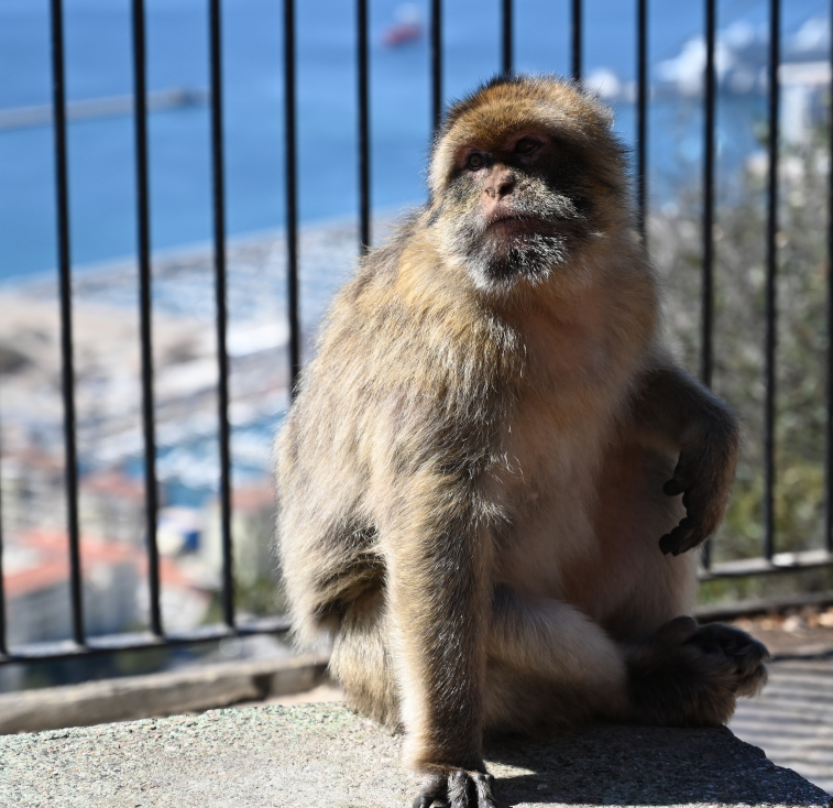 Gibraltar is 95% a huge slab of rock, sticking up from the Mediterranean in one direction and out from Spain in the other direction. As soon as I saw the behemoth rock I knew I would forsake the cable car and climb up it instead, forgetting yet again that walking uphill in the [sub]tropics is not my favorite pastime. The angry eye of the sun beat down on me as I wound through the streets of the cute seaside town, up the stairs of its back alleys, and finally through switchback hiking trails of the national park. Maybe an hour later, I reached the Top of the Rock (yes that’s its actual name, bless the Brits’ hearts). I was roasted and dehydrated and a bit delirious by that point. Walking the narrow bridge into the terminal cable car/restaurant entrance in such a state, I was not expecting to come face-to-face with a wild Barbary macaque.