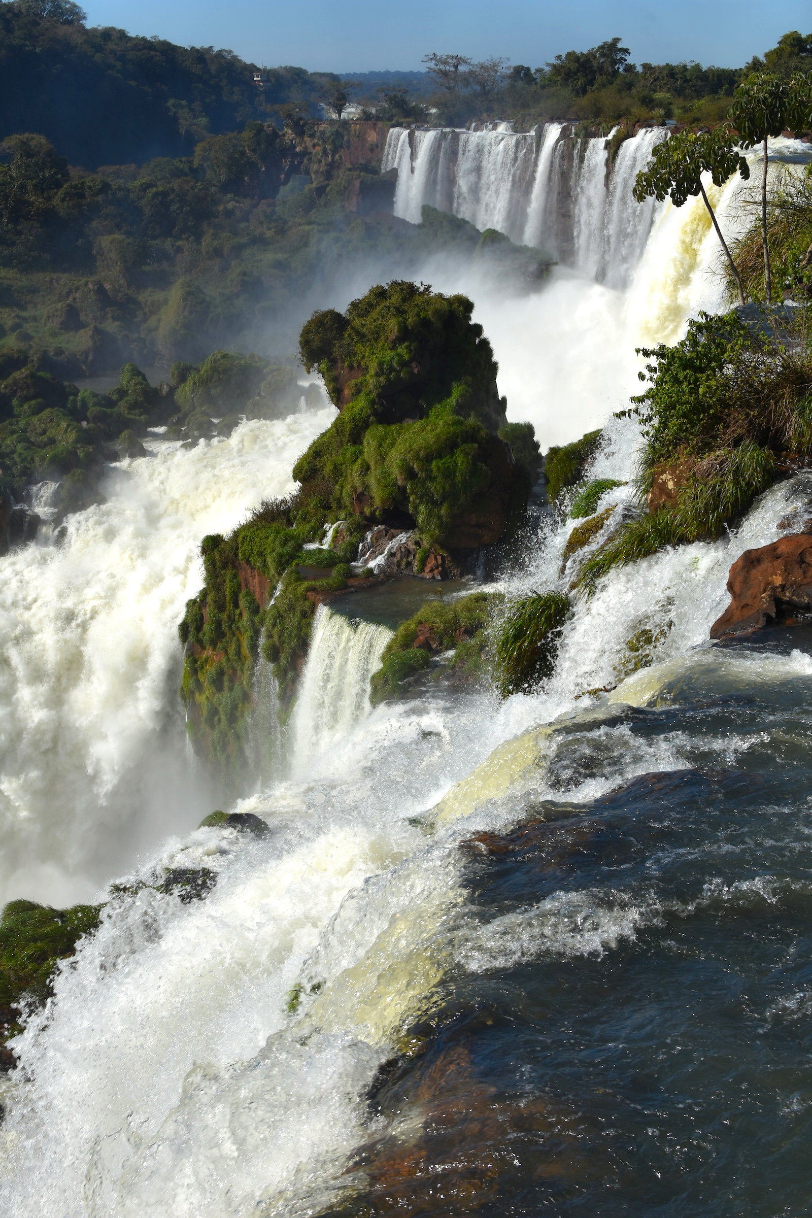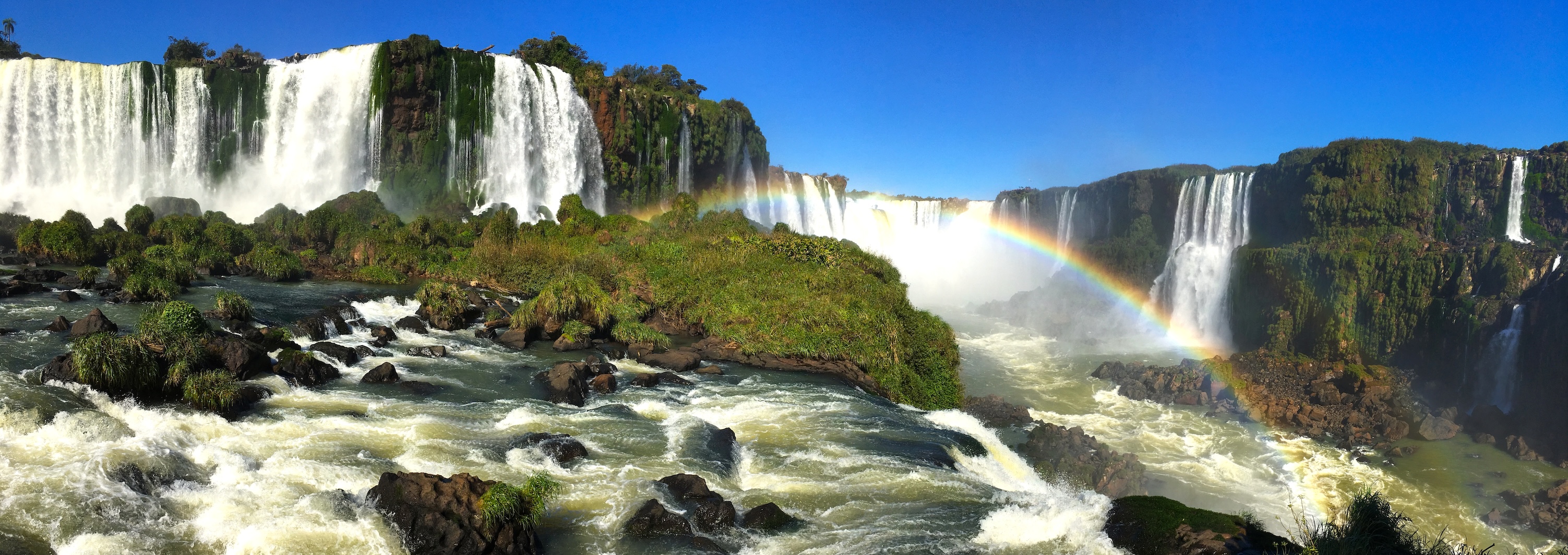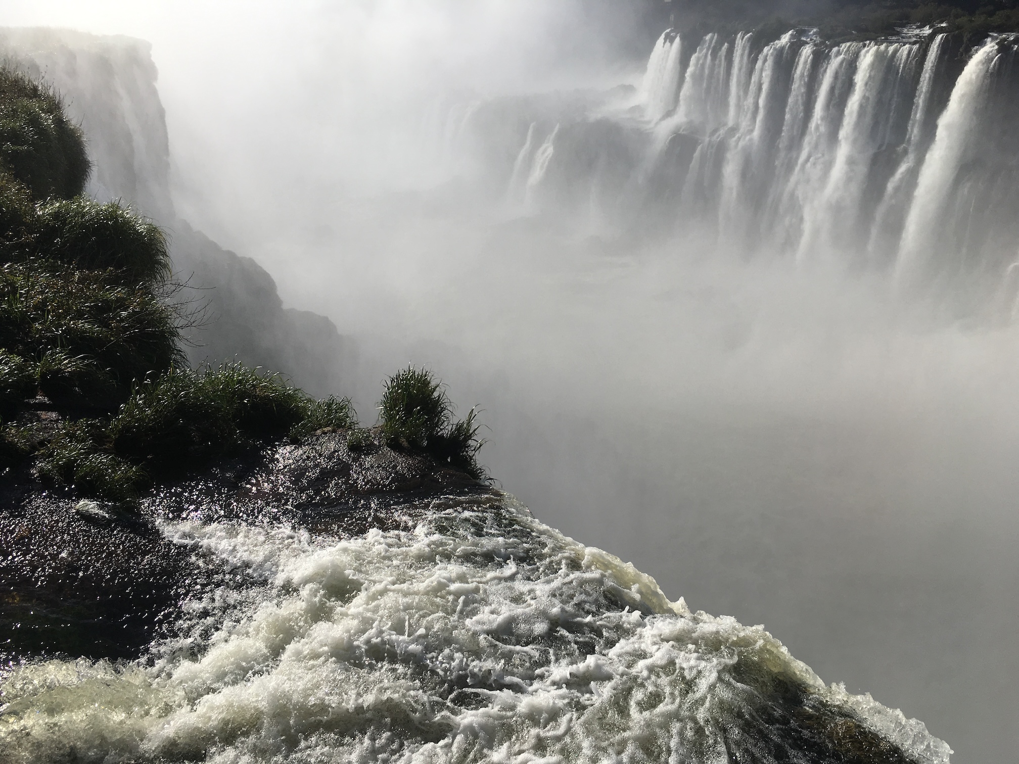 I walked out of the Argentinean jungle and let the boardwalk carry me across a wide shallow river towards Brazil, waiting on the opposite bank. The humid air was a highway for butterflies and toucans, and a medium for the overlapping calls of exotic critters. Underneath these jungle sounds, though, there was an endless thunder-like growl, coming from the great beast that waited for me at the end of the boardwalk. The first glimpse of the monster was its breath, a fine mist rising from the beyond. Then the silty green water just beneath my feet started to flow faster. Finally the riverbed gave way completely and I stared down into a churning white abyss, a hole in the Earth that’s rightfully been named the Devil’s Throat. Doubtless it could have swallowed me whole. Parallel cliffs thrust out from both sides of it, one Brazilian and one Argentinean, and both wore identical veils of falling water that filled my lungs with vapor and my eyes with rainbows.